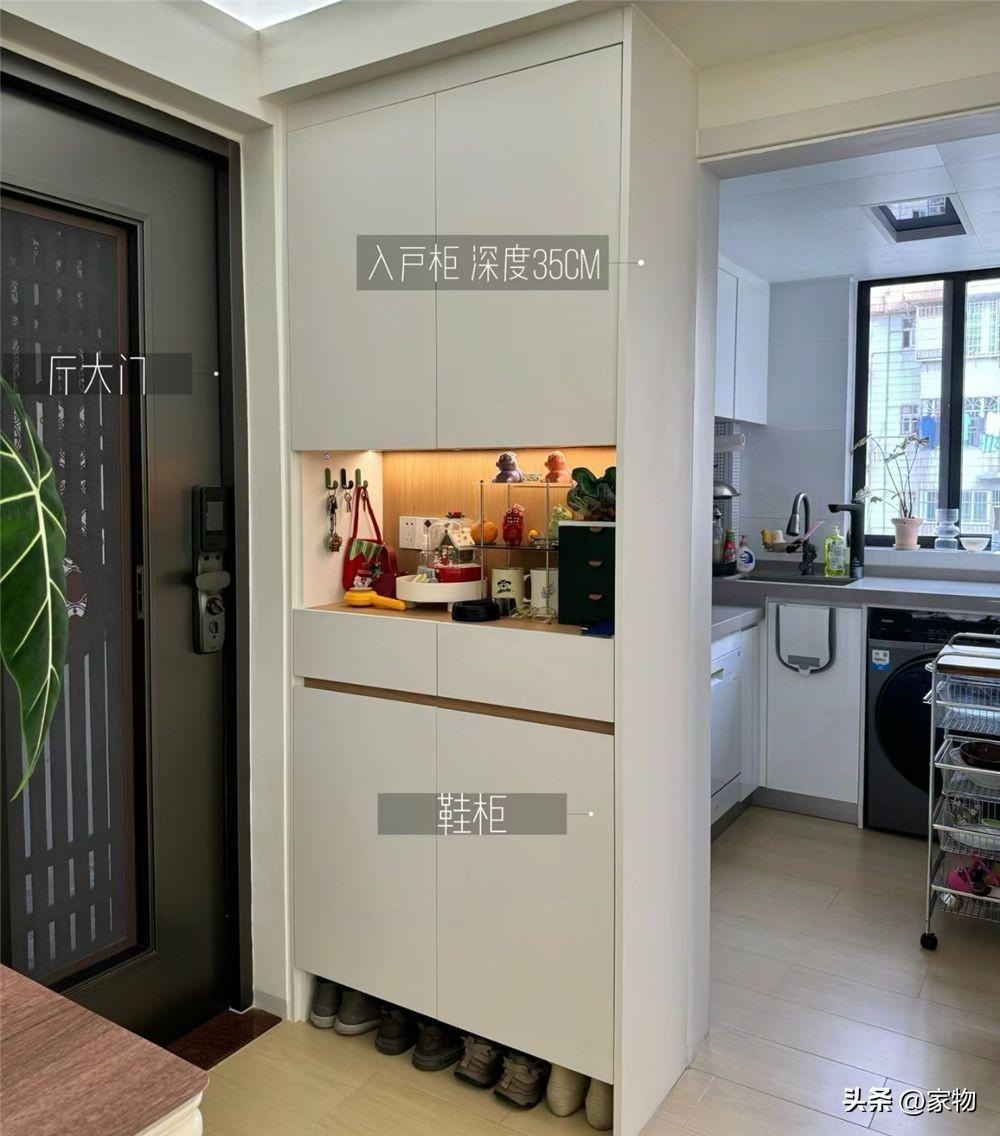 剛一進門,左手邊就是一組三段式鞋櫃,它承擔了家裏過渡區的功能,深度有35釐米的樣子,上櫃可以收納各種雜物,中間櫃格放置進出家門時的隨身物品,下面鞋櫃還留出一個空格換鞋區,常穿的鞋子可以直接推進去,不顯亂。