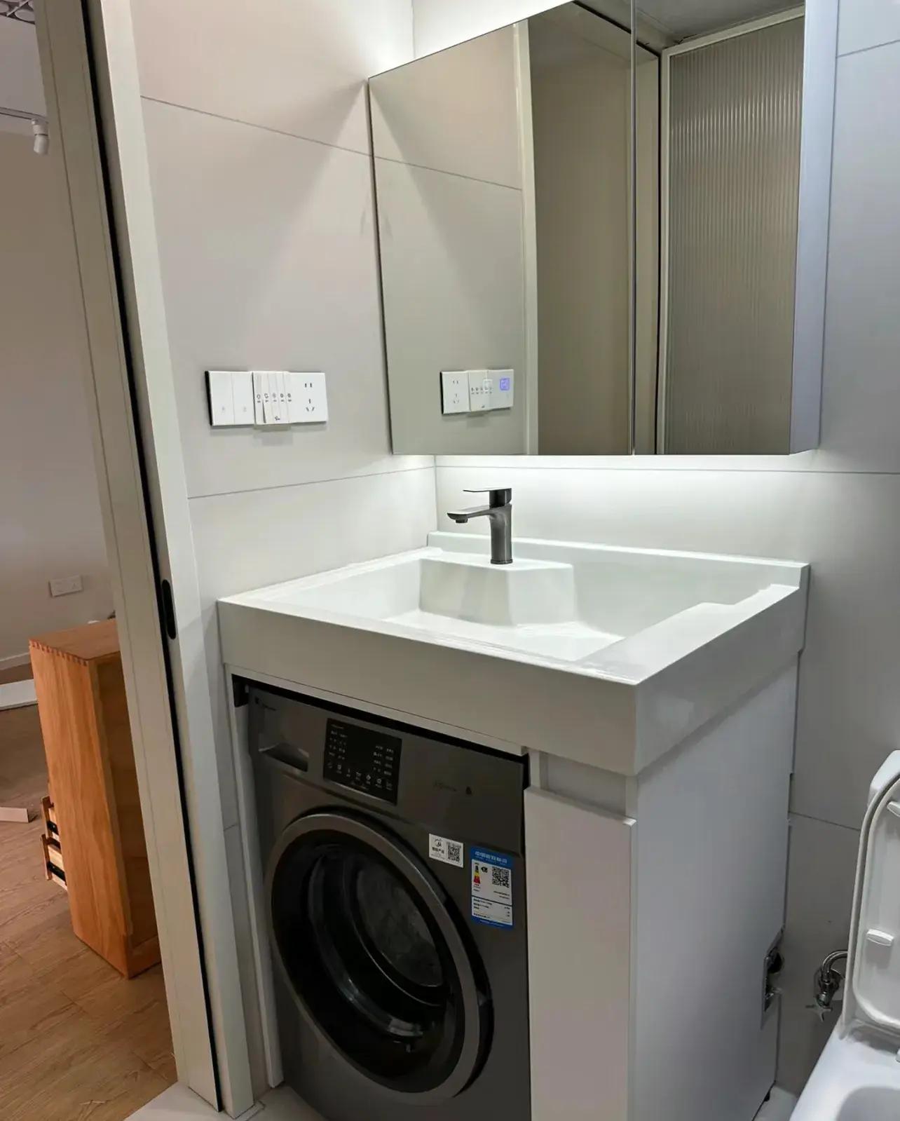 86、洗衣機上做臺盆不靠譜,洗衣機都80高了,臺盆你做到90釐米高,臺盆深度纔不到10釐米,那得濺水濺成什麼樣子呀;