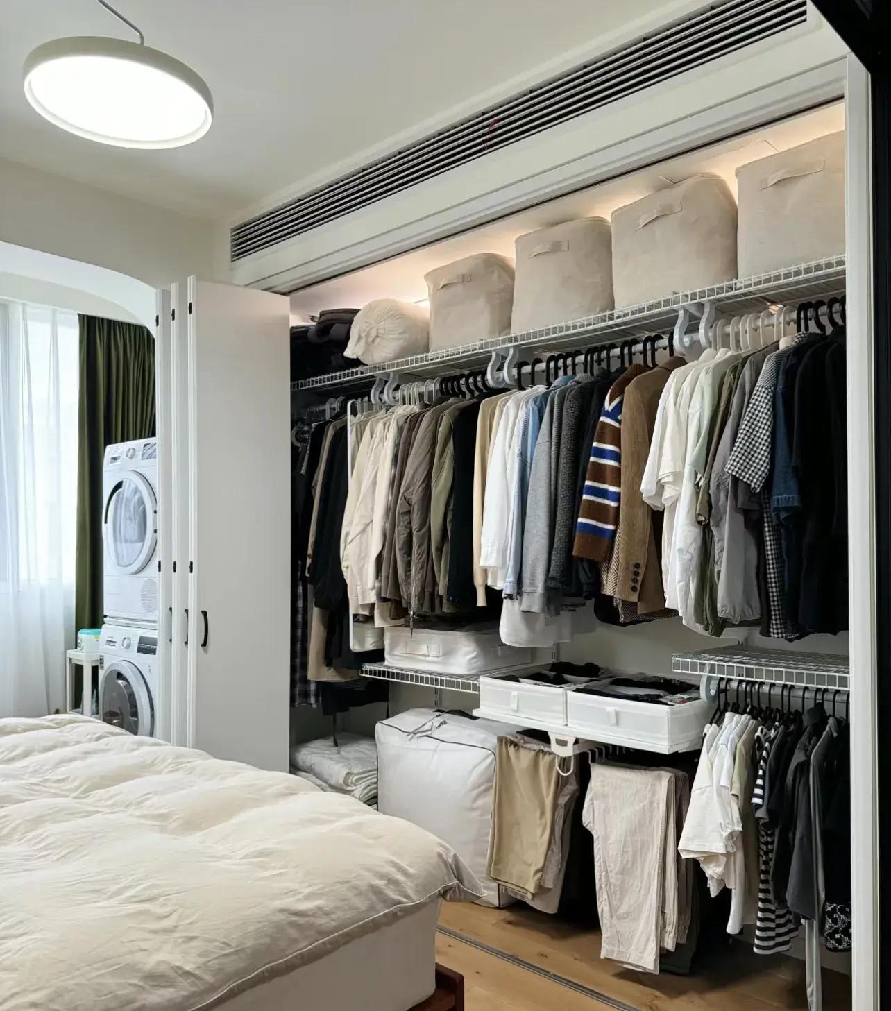 69、金屬衣櫃,YYDS,又可以調節佈局,足夠靈活,又沒有甲醛,是個好選擇,注意背景牆面最好貼個壁布或者壁紙。