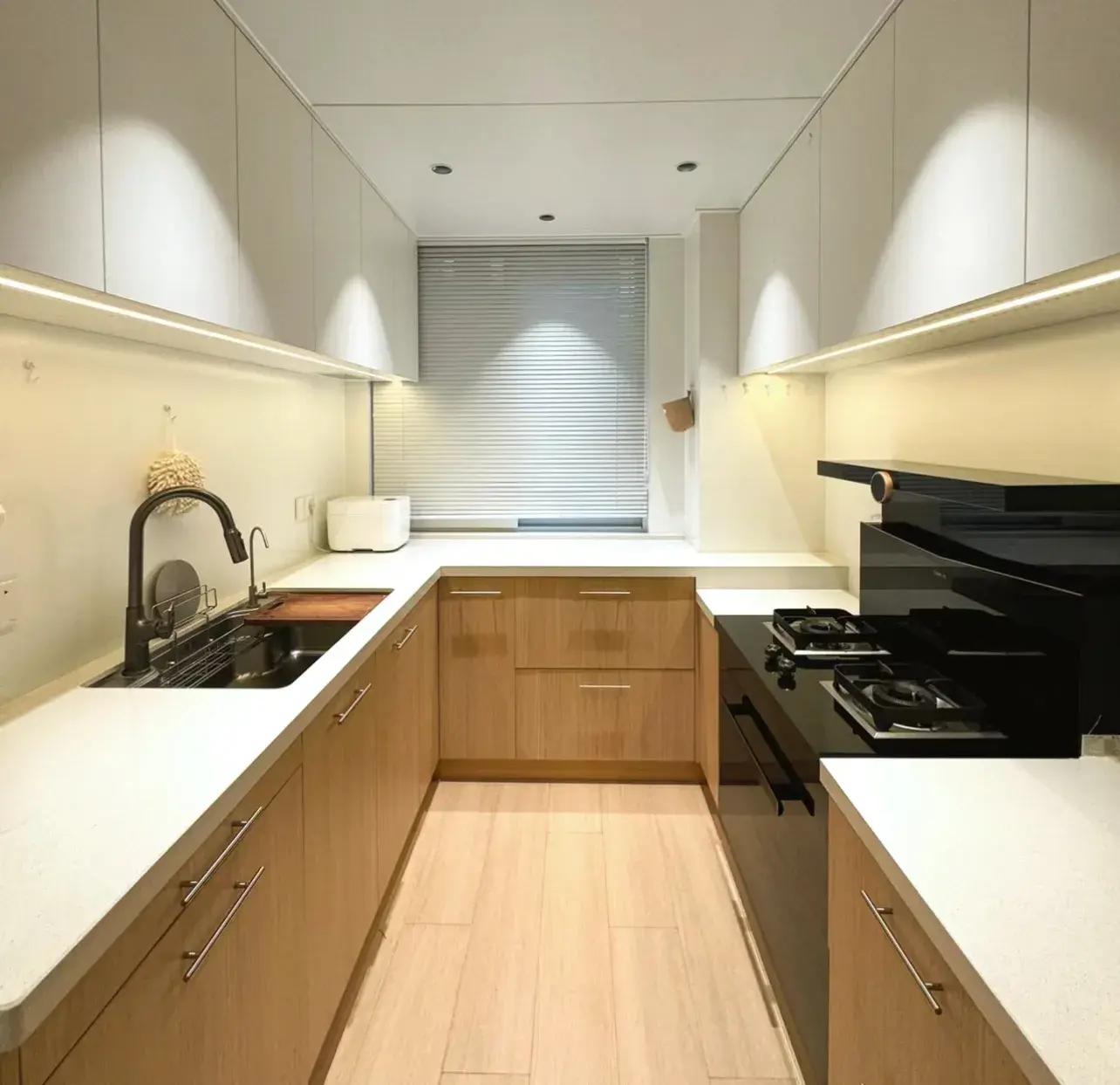 29、做好給水槽區和切菜區,上方做一個燈帶,確保下廚操作的時候,是亮的。廚房只做一個燈,人會擋操作檯面的光。