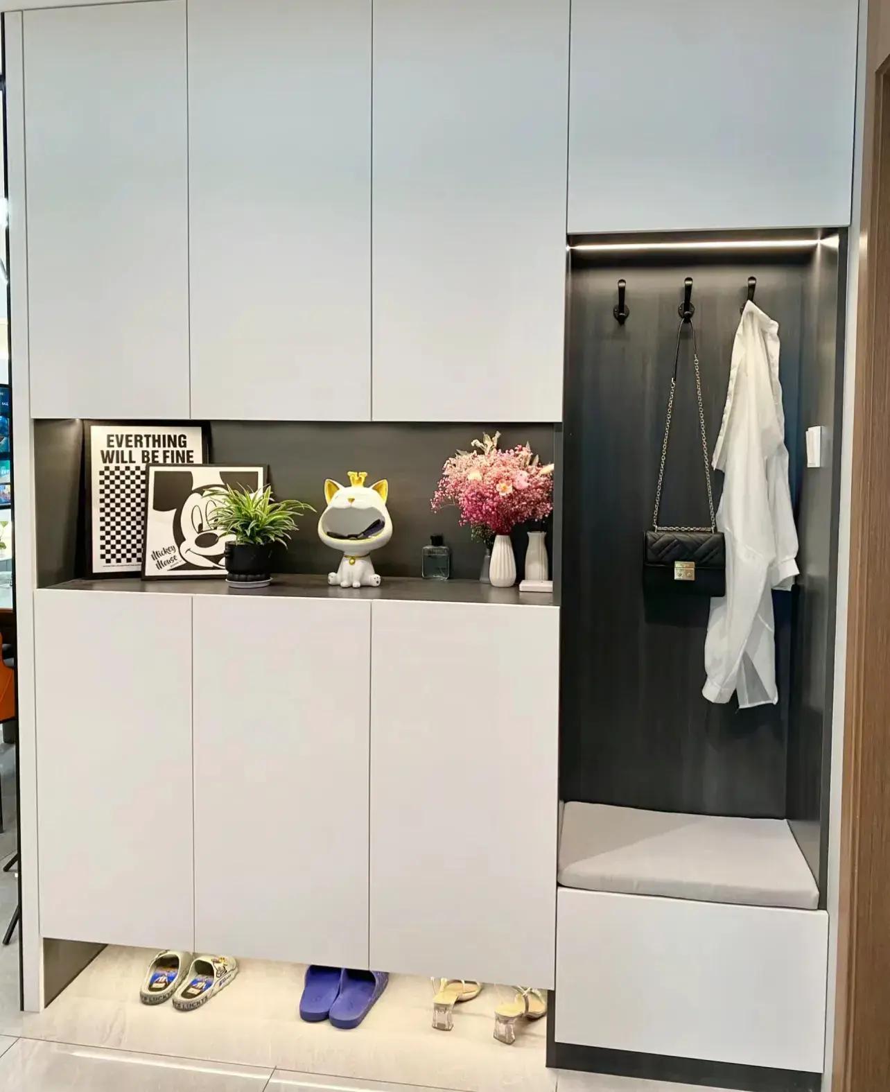4、給玄關櫃設計了換鞋凳,以爲又可以掛衣服,又可以坐着換鞋。誰曾想,衣服掛上去之後,就定在哪裏了,坐着換鞋也太憋屈,大家還是蹲着換鞋;
