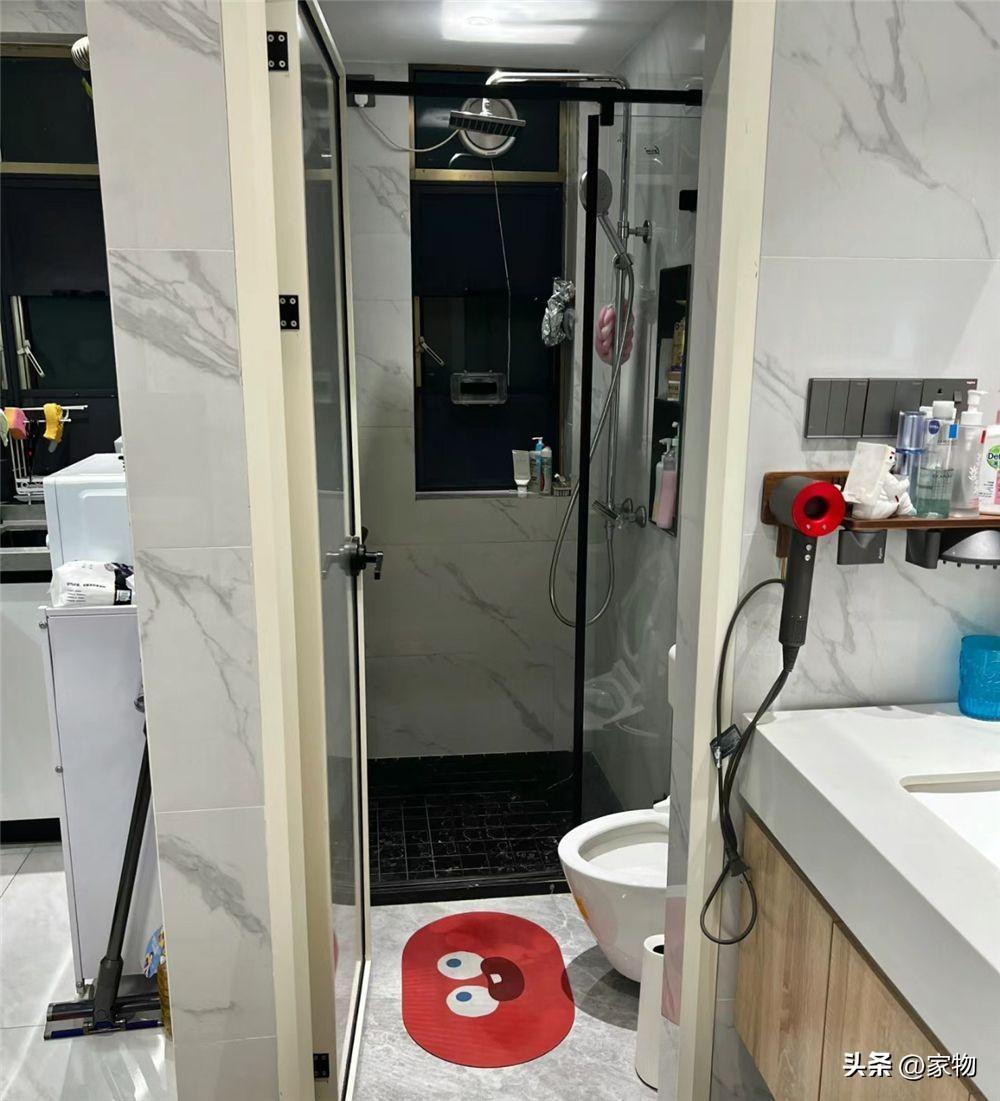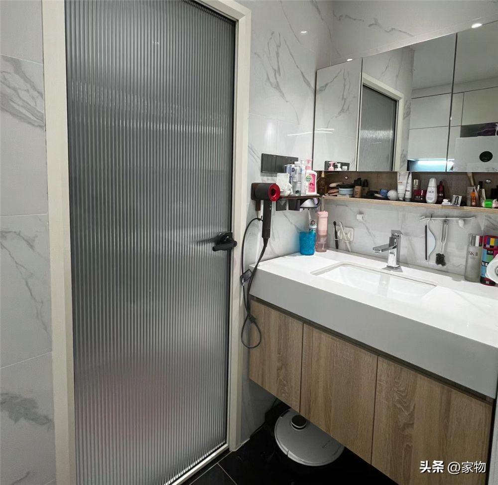 衛生間的洗手檯外移,做鏡櫃和大洗手池櫃,可以收納下這位姑娘較多的清潔洗漱用品,最起碼明面上不會顯得雜亂無章,檯面充足的空間也方便日常清潔洗漱,佈置面面俱到。