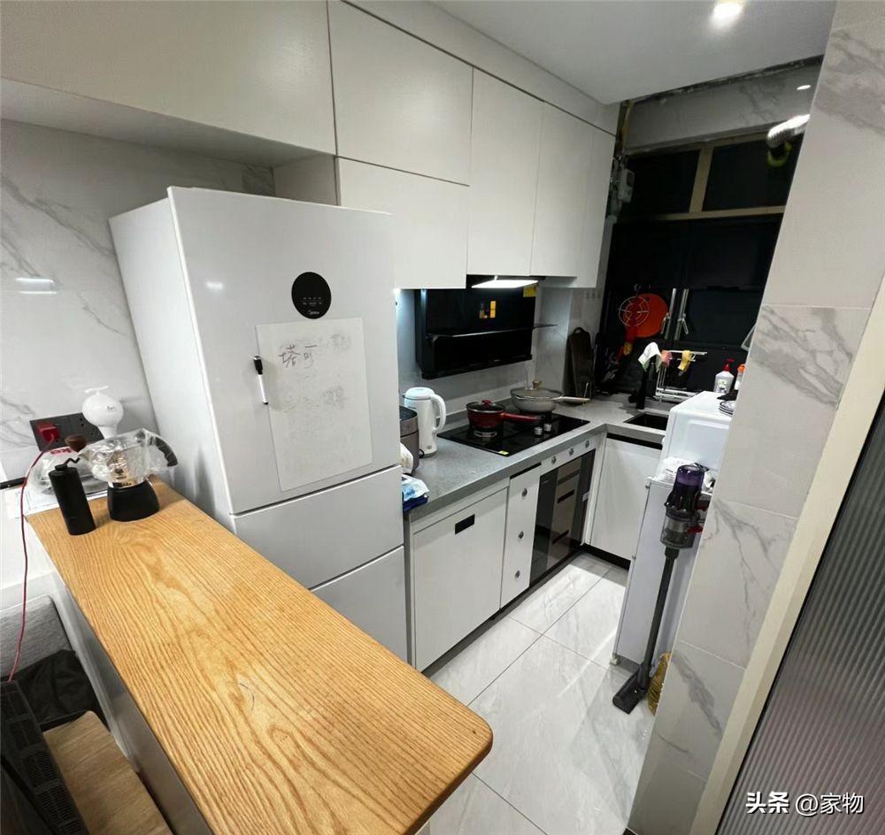 廚房與餐桌僅用一張吧檯桌隔斷,做成半開放式格局,空間很大,起碼對一間43㎡的老破小來說已經是非常不錯了,廚房內L形櫥櫃搭配吊櫃,也能有充足的碗碟餐具收納空間。