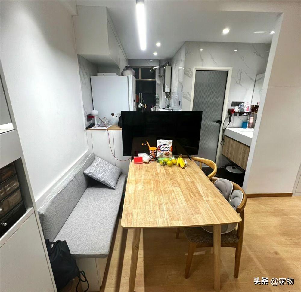 說回餐桌,它選擇了四人位餐桌,一邊靠牆做卡座,一邊放兩把餐椅,既可以同時坐下四口人共同用餐,又能避免浪費空間。