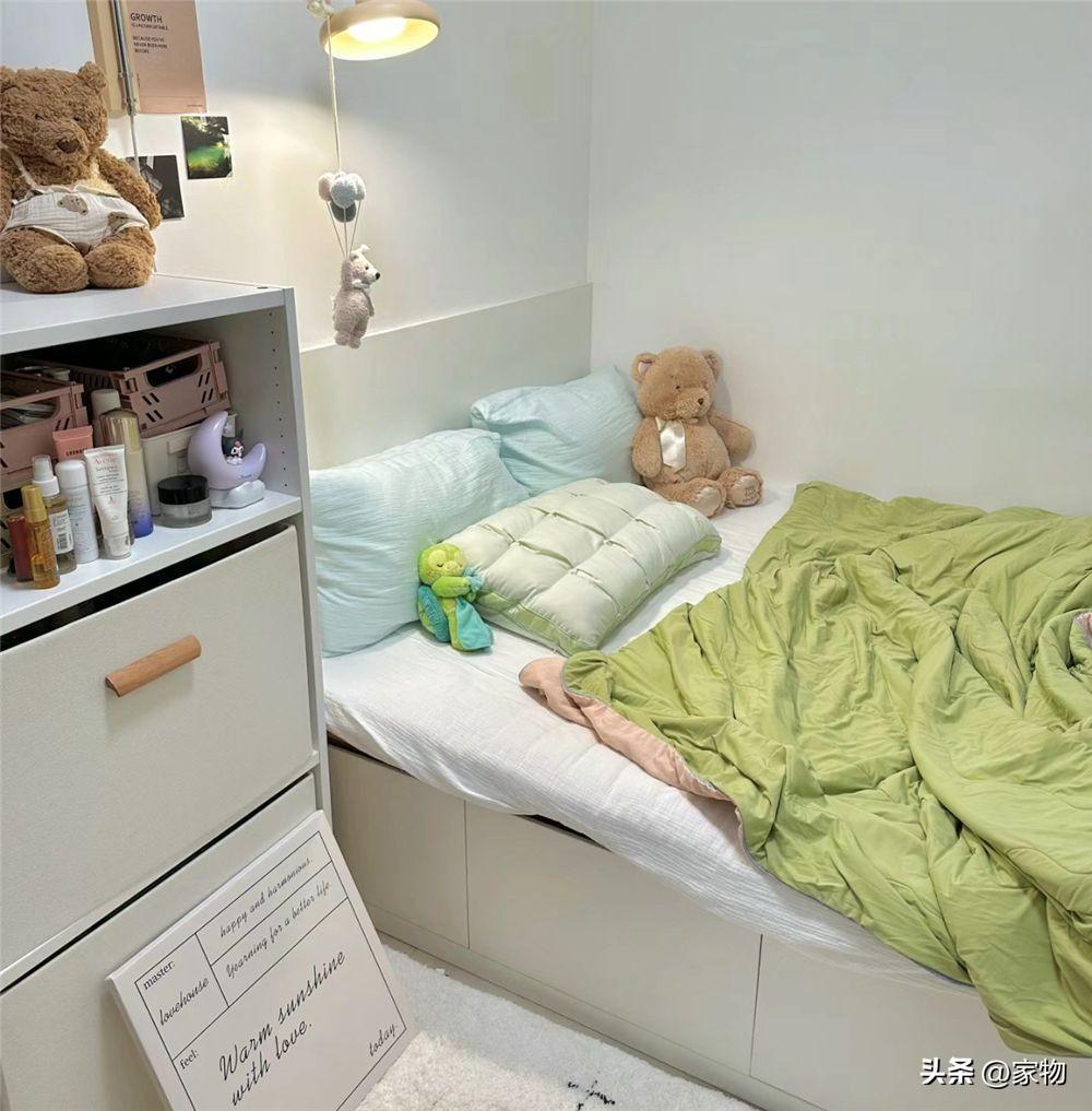 客廳對面還有一間小小的臥室,這間臥室非常之小,放上一張雙人牀和一個矮櫃就沒有再多的空間了,不過好在她一個人住,有這樣的小空間也算是很溫馨很舒適的了。