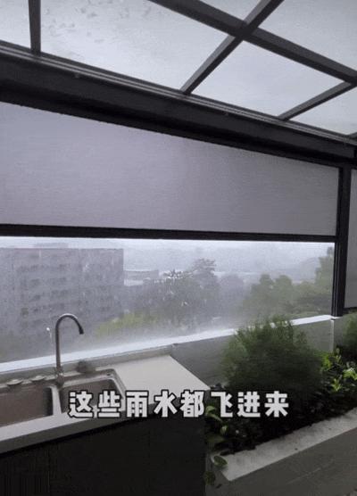 遙控升降的遮陽簾+防雨簾組合,紗網和捲簾兩用,好天只需要打開高透紗網,不擋風景,又通風,還能阻擋蚊蟲灰塵;一遇雨天,它能自動感應,啓動防雨簾,功能可以說很全面了。