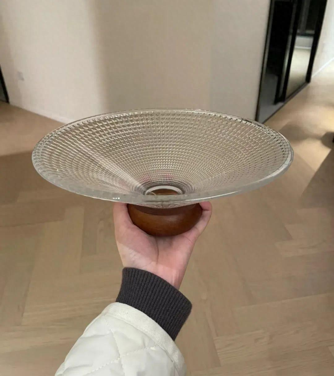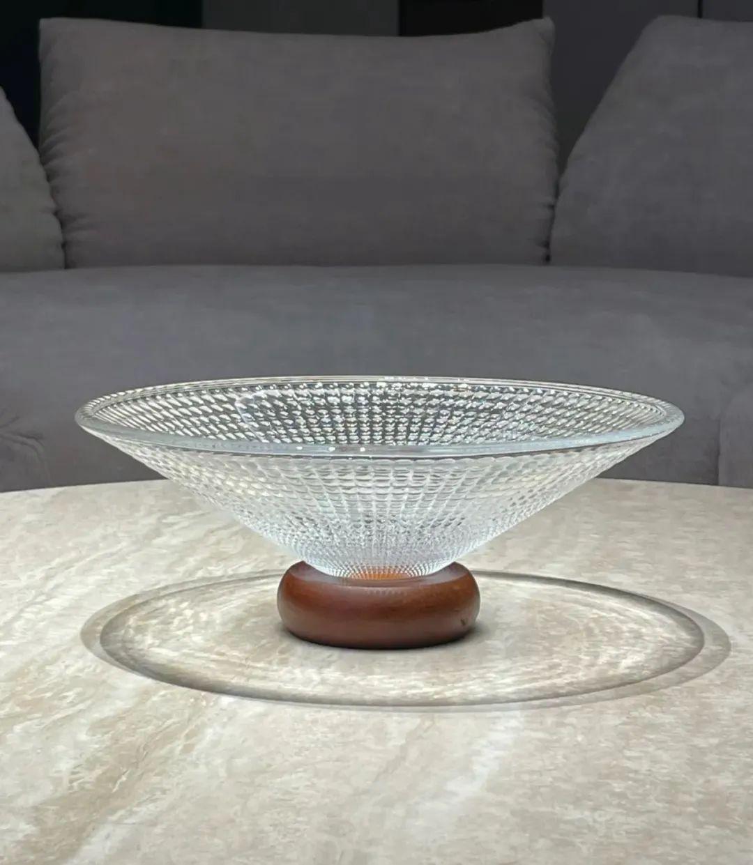 類似這種復古簡約風格的果盤就很好看,實木底座搭配豎紋水晶盤,穩重中又多了點精緻生活的優雅~