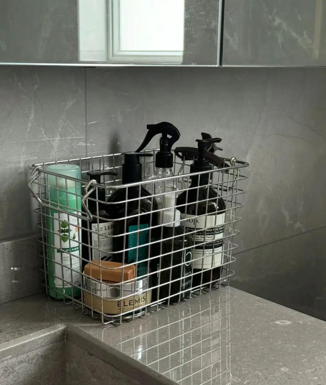 此時,一個不鏽鋼的收納籃太有必要了,容量夠大,所有洗化用品全都能裝進去,籃子底下鏤空便於通風,檯面乾的更快,也不會滋生黴菌。
