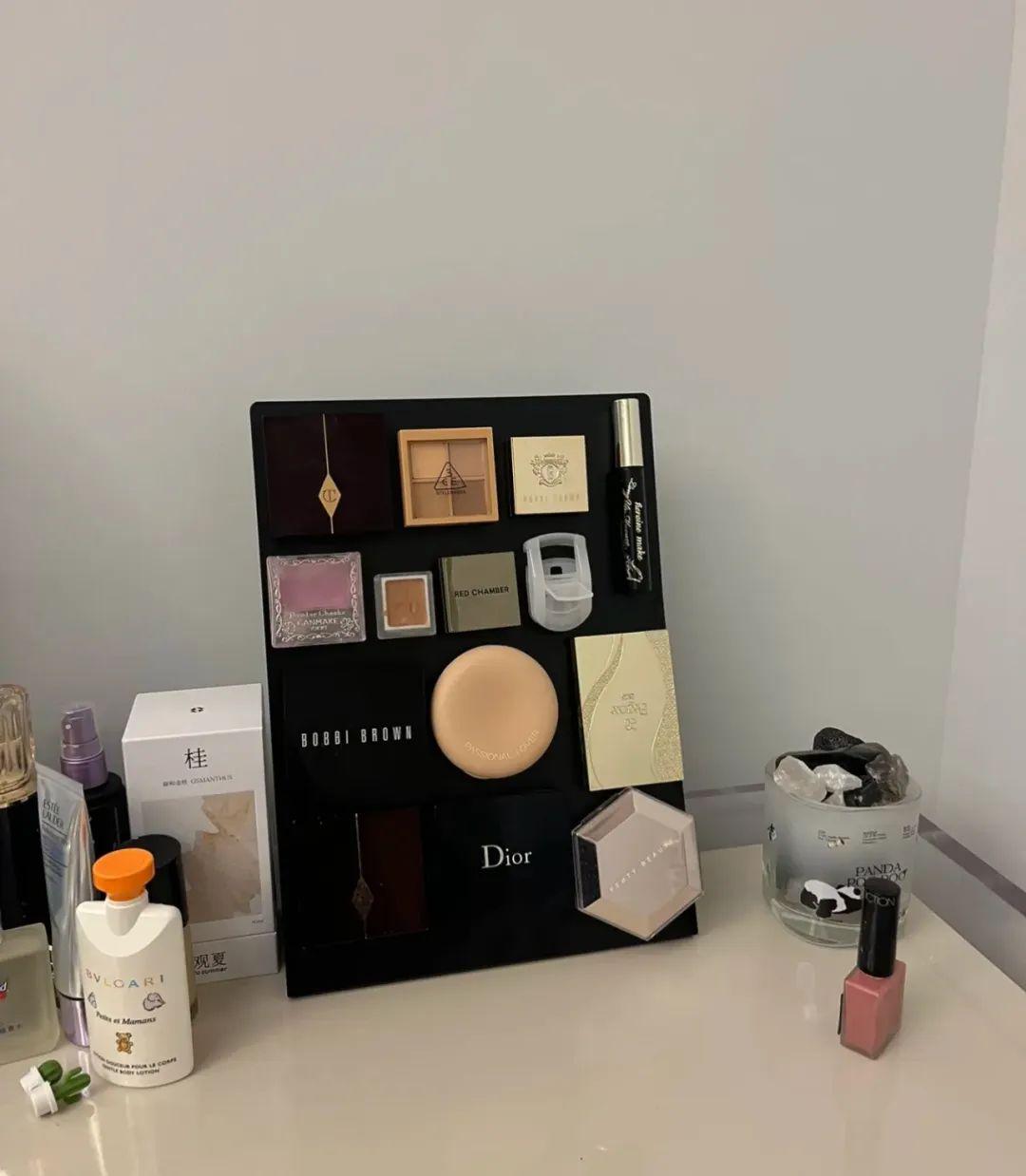 再分享一個我最近發現的化妝品收納新妙招,僅適合家裏化妝桌面積有限的朋友。準備一塊磁性小黑板以及一卷軟磁條,裁剪好磁條形狀後貼在彩妝用品的背面,這樣所有的彩妝用品都能吸附在小黑板上。