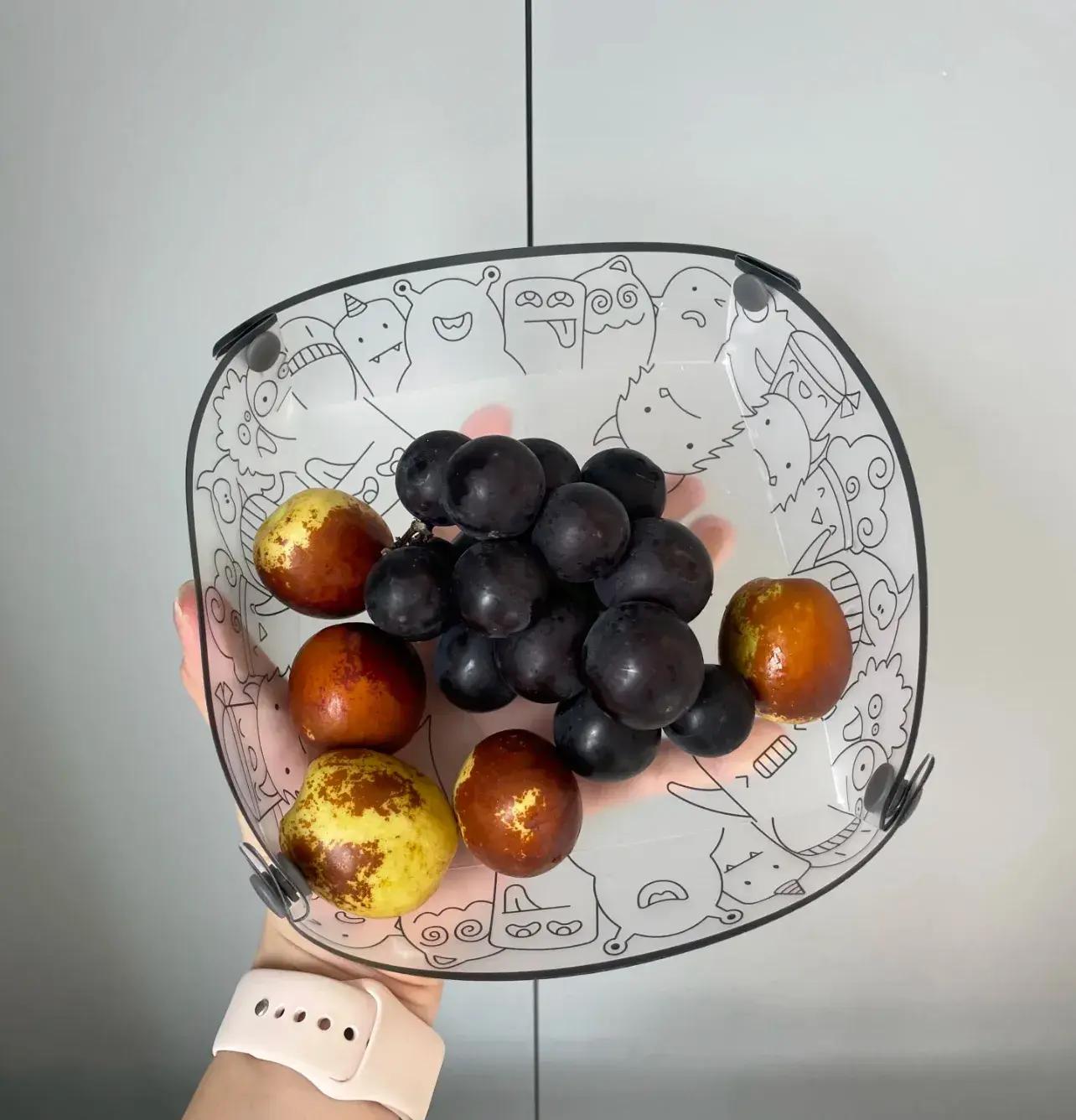 四邊的暗釦折起來後,它才變成碗;而不折平鋪開時,則是一個小菜板。