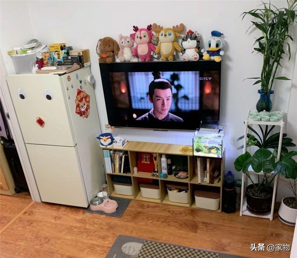 至於電視櫃的兩側,一側放置冰箱用作收納,另一側放花架增添綠植,讓蝸居更有生機活力。