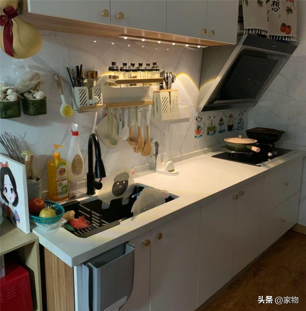 回到一進門的位置,廚房的面積反而會顯得大一些,一字型的櫥櫃搭配吊櫃,可以將亂七八糟的碗盤餐具統統收納到櫥櫃內,明面上東西雖然也不少,但總覺得亂中有序。