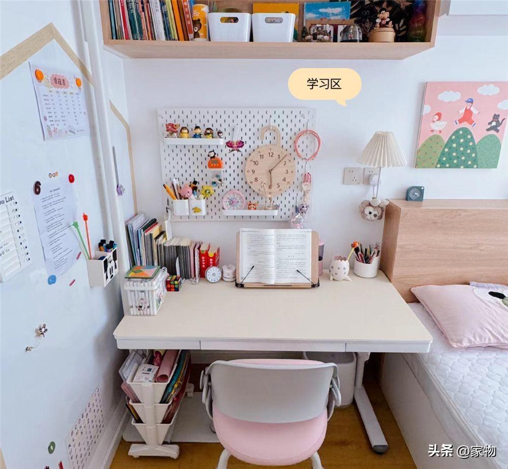5㎡多點,不到6㎡的兒童房,真是將能利用的空間都充分利用了起來,進門的地方放學習桌,牆面也安裝了磁吸白板、吊櫃等一系列物品,看似滿滿當當,實則亂中有序。