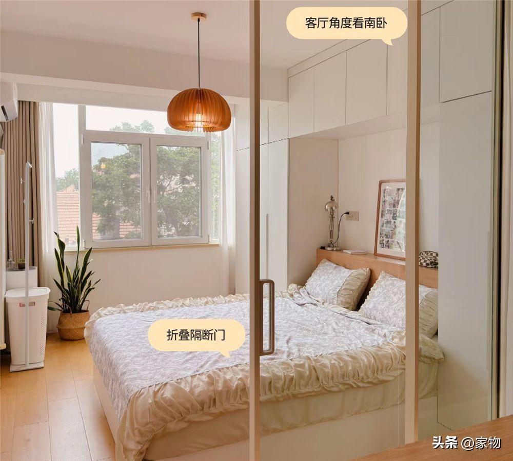家裏的主臥室,用玻璃門與客廳進行簡單的隔斷,三疊門可以完全展開,將臥室空間也融入客廳,顯得更加寬敞明快一些,拯救了暗廳採光差的煩惱;牀頭一圈櫃子,則足夠收納夫妻二人的衣物和生活雜物,佈置井然有序。