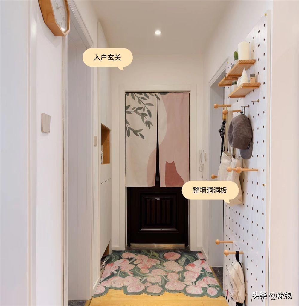入門處的玄關,是一條狹窄的走廊,雖然兩側牆壁中間留出的空間不算大,但牆面卻有足夠的面積,安裝洞洞板放掛鉤板材,和一系列雜物剛好合適,用起來十分靈活。