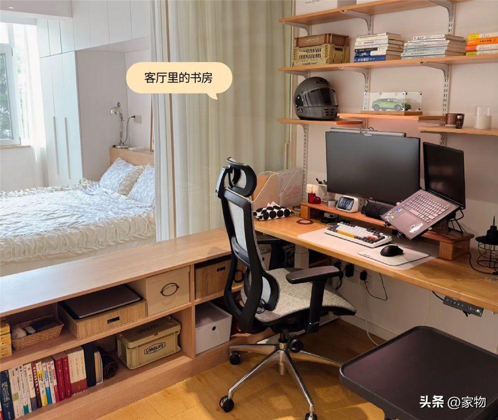 書房在沙發的另一邊,嚴格來說也算是徹底融入了客廳的空間,書桌和矮櫃形成一個L形的工作和收納空間,無論是日常辦公遊戲,還是收納一些文件雜物,統統不在話下。