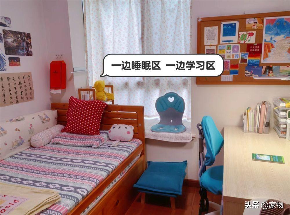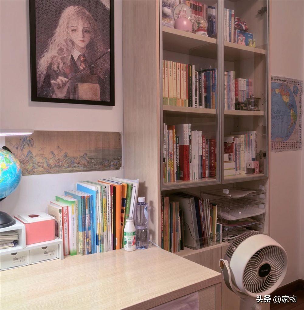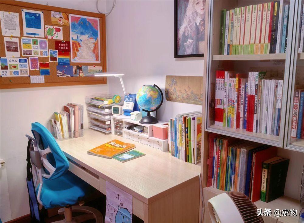 唯一美中不足的,就是因爲牀頭佔據空間較多,沒辦法把書桌靠窗擺放,採光基本上只能靠桌面上的檯燈,但總體來說無傷大雅,最起碼孩子這隨手整理和收納的習慣,就培養地很好。