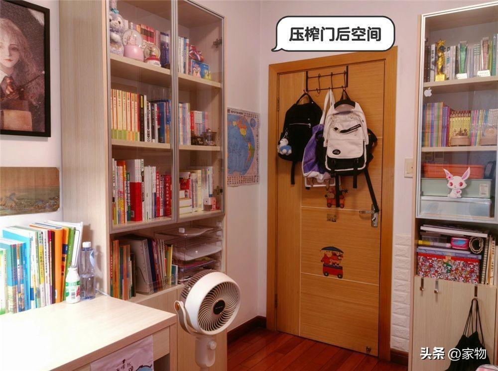 臥室的入門區域,被這位老母親佈置成了一個收納空間,除了利用門後空間安裝掛架進行收納以外,還在兩邊都擺放了櫃子,增加書籍文具的收納空間,僅讓出一個門口。