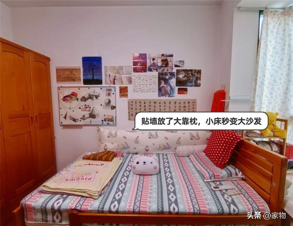 之所以放大靠枕,也是爲了能給這間學生房增加一個臨時休息、放鬆的“沙發”,孩子既可以坐在牀鋪上看看書、玩會兒手機,又能讓老母親在輔導作業的時候,有一個可以坐下的地方。