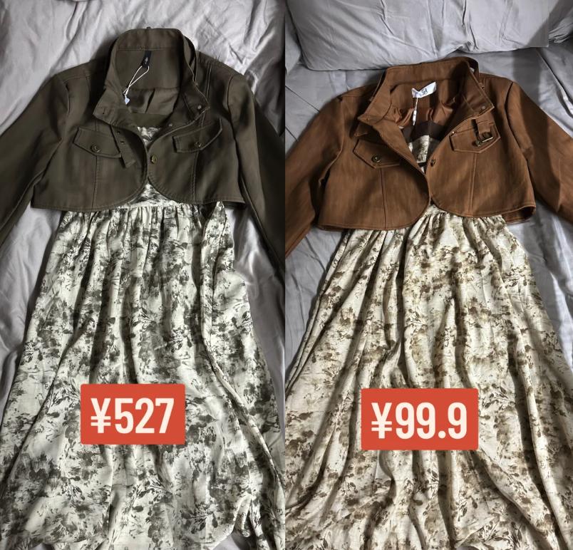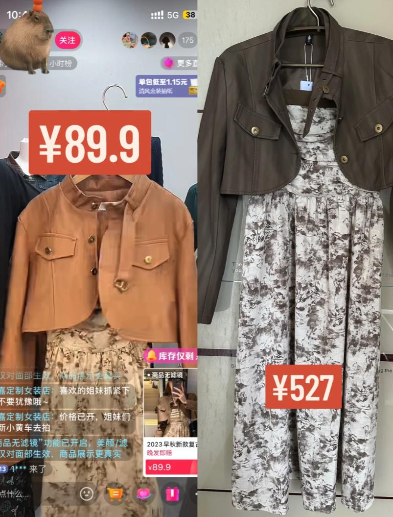 還有實體店的女裝更是離譜,也就是一個路邊店鋪,不是什麼連鎖大品牌,走進去看中一件挺洋氣的一套衣服+裙子,一問價格打折後還要527,當時覺得有些貴,但因爲很喜歡這個款式還是買了…誰知道當晚就在網上刷到了同款服裝的直播,居然一套只要89.9元……