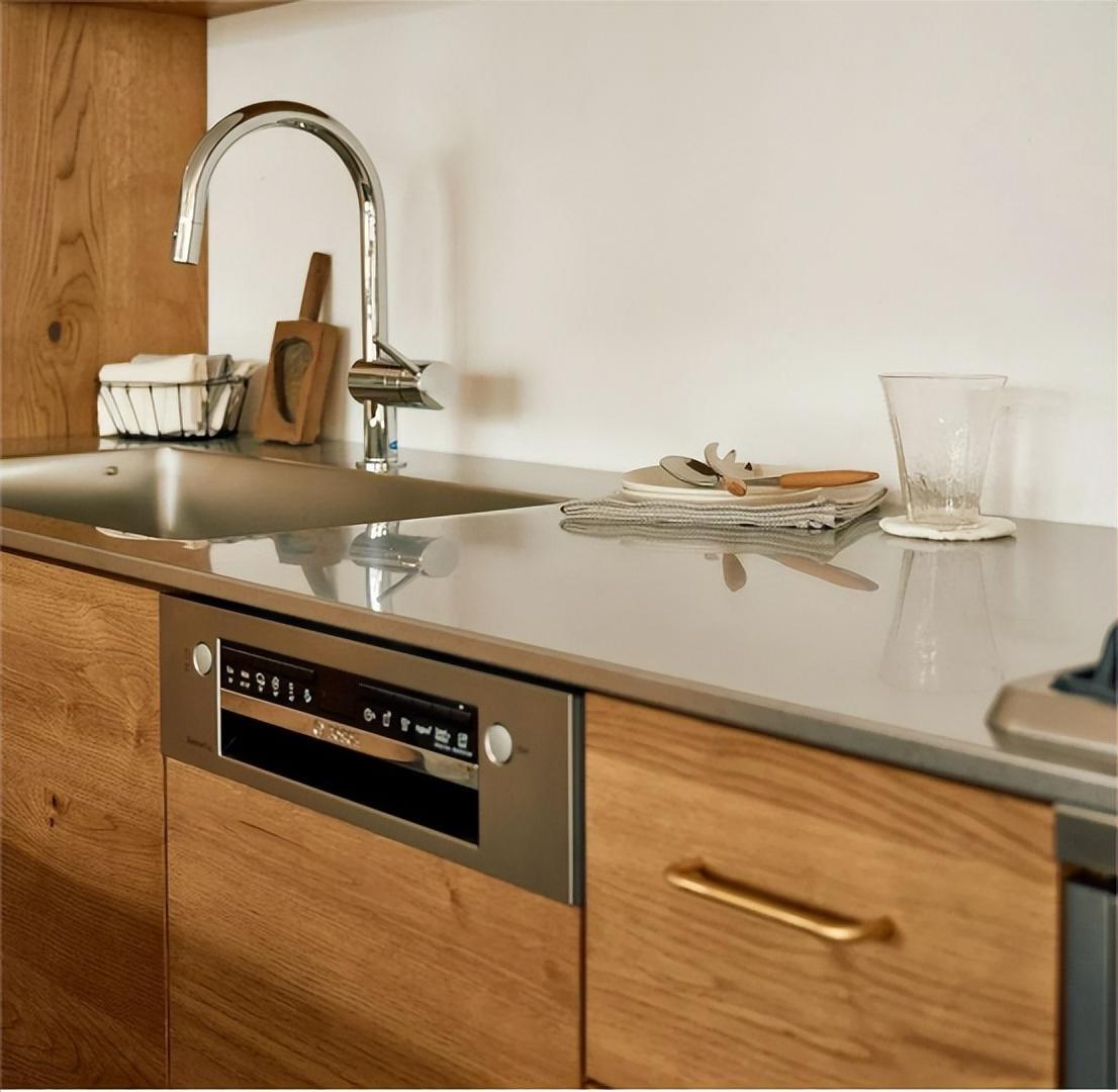 不鏽鋼檯面流行過很長一段時間,因爲它材質堅挺好打理。但老式的不鏽鋼檯面是一層薄薄鐵皮包裹厚厚的板材,總給人一種飯店後廚的感覺,不夠高級,以至於被石英石等其他石材代替。