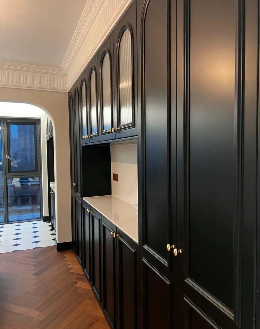 在十幾年前的櫥櫃、衣櫃做這種回字形裝飾紋很是流行。但複雜的線條裝飾,在實木門板上,首先帶來的麻煩就是難清潔,特別是在廚房油煙區。所以很多家庭在裝修時便優先考慮光滑面的烤漆板或者晶鋼門板。