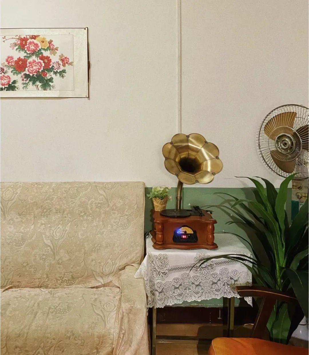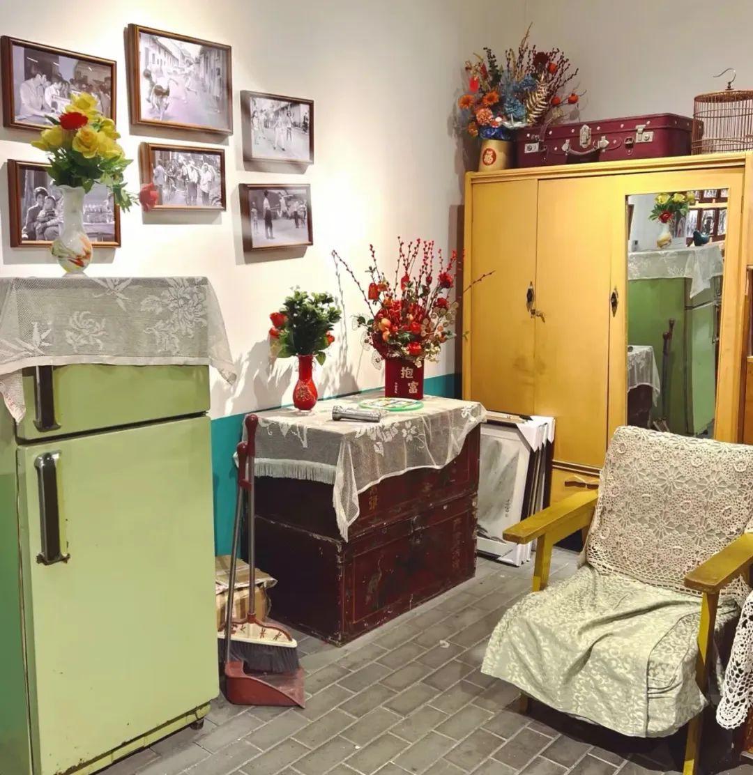 那個時候真流行這種上白下綠的牆面,漆面還經常被小孩摳掉,木頭長椅靠着斑駁的綠牆,童年畫面閃現了。以前刷綠漆是爲了防止人蹭到石膏牆上的白灰,不過後來乳膠漆引進,也就不存在這種需求,拼色牆也消失過一段時間。