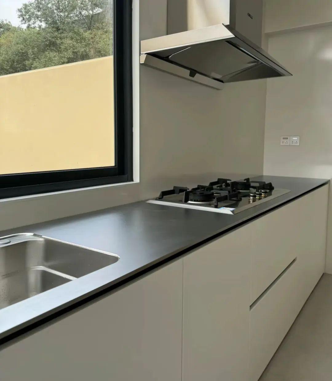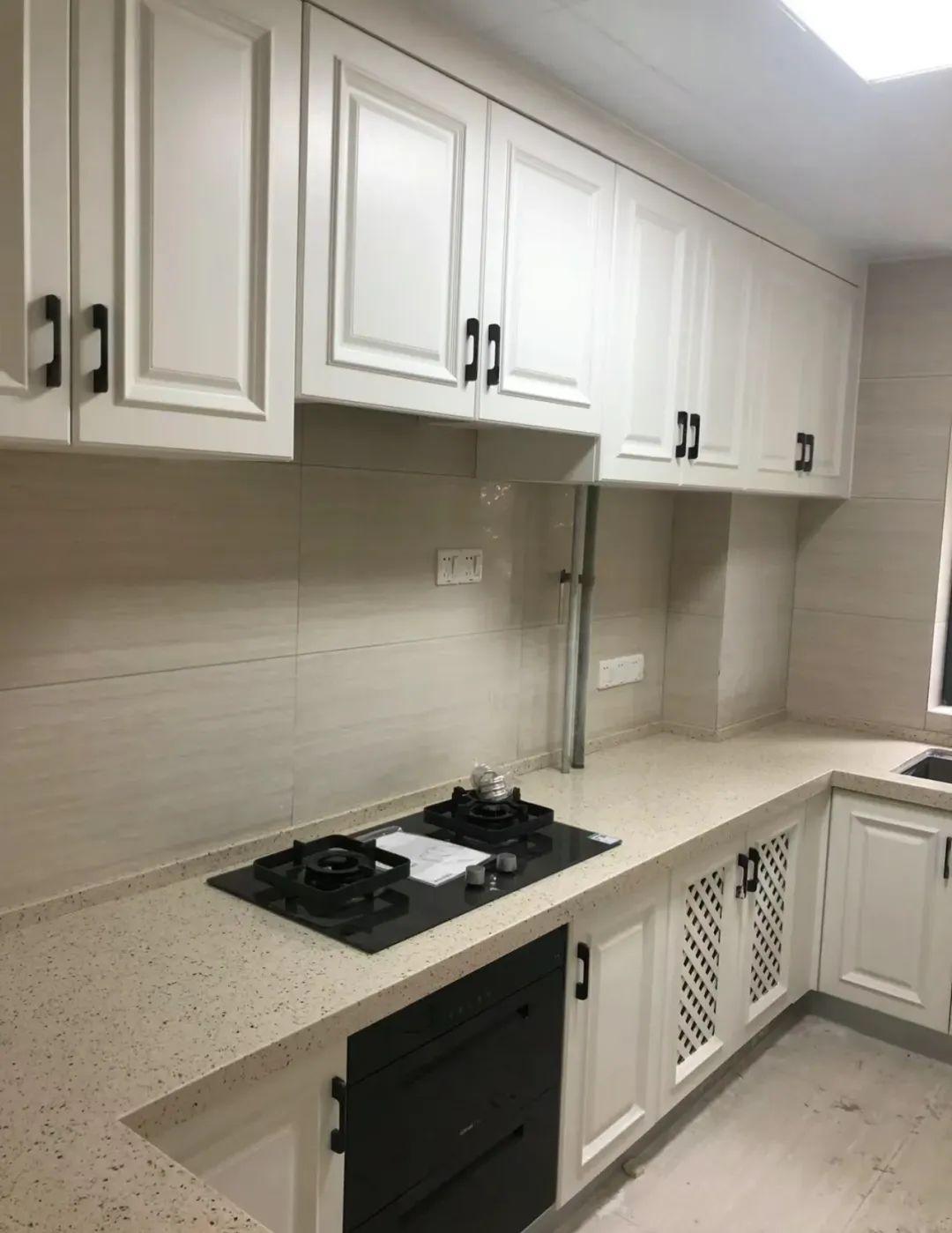 裝在現代廚房裏,效果真的很不錯。在重油重污的廚房裏,優勢碾壓其他材質,不發黴,不滲色,不開裂,要麼怎麼說廚房的盡頭是不鏽鋼呢。