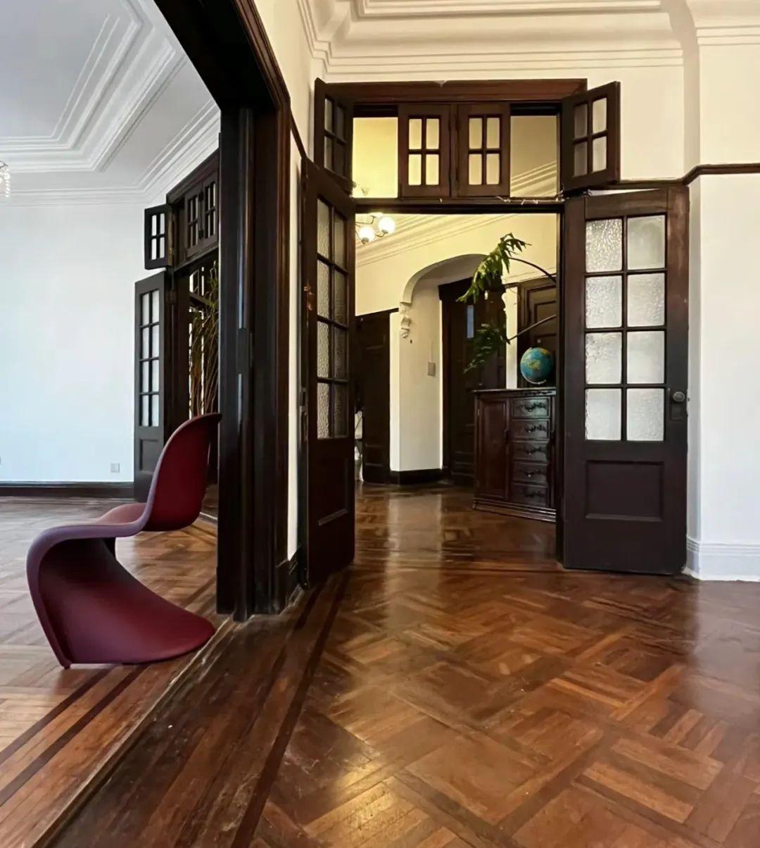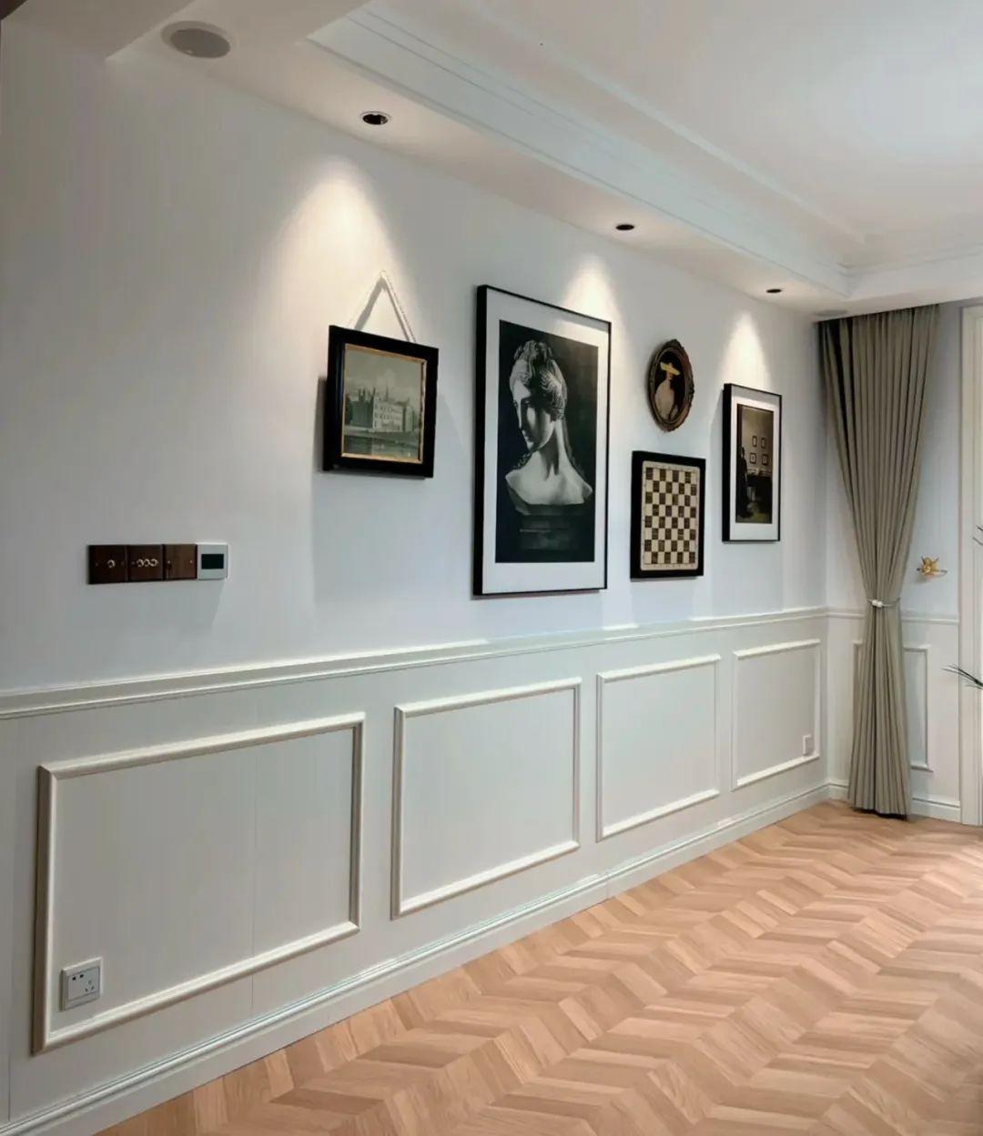 米白色牆面,搭配復古石膏線條和拼花地板,帶來輕奢復古風,魚骨拼法視覺上也很舒適,有種對稱美。