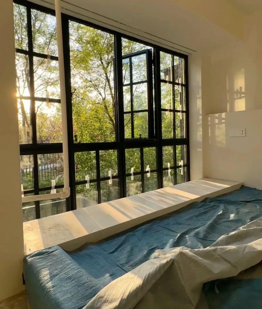 臥室也能配上黑色老鋼門窗,更增添了份慵懶,愜意的氛圍感。