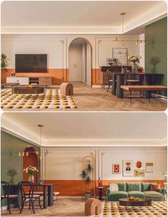 不過現在,設計師們在色彩美學上玩出了新高度,牆面藝術化也是實現了無限可能。比如這種,牆面乳膠漆做復古撞色處理,橘色和綠色搭配,色彩感豐富,清新又有活力。