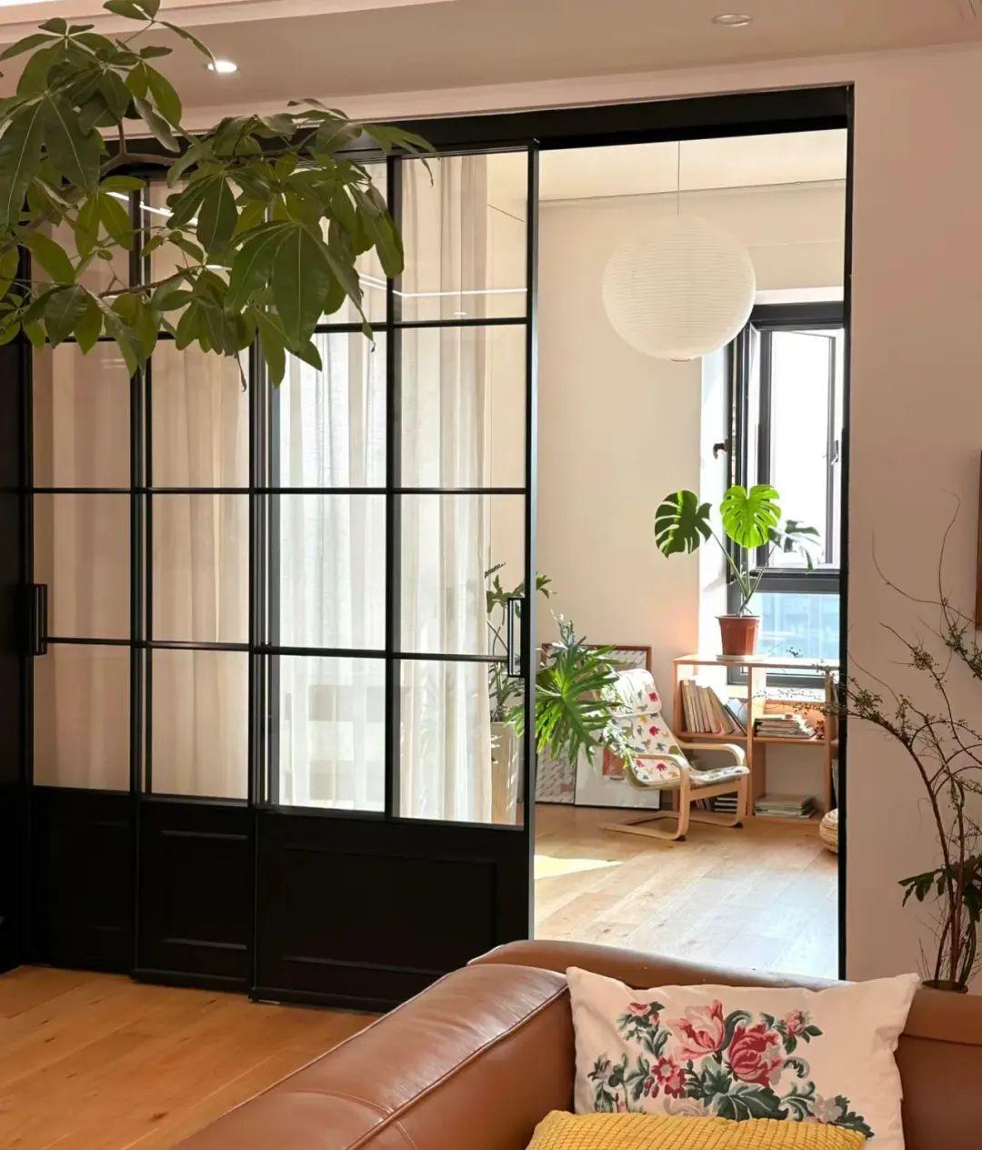 客廳隔斷處裝格子推拉門,復古膠片感到位了。