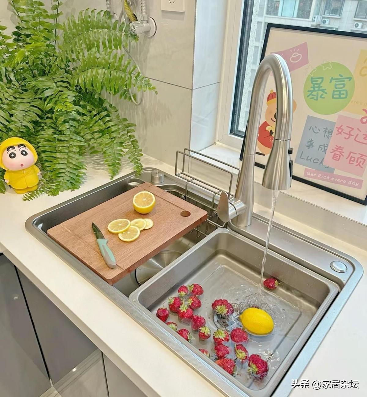 而且,你會發現,現在的大單槽,都配有一個單獨的水槽。如果我們需要浸泡水果等,就可以把這個水槽搭在上面。