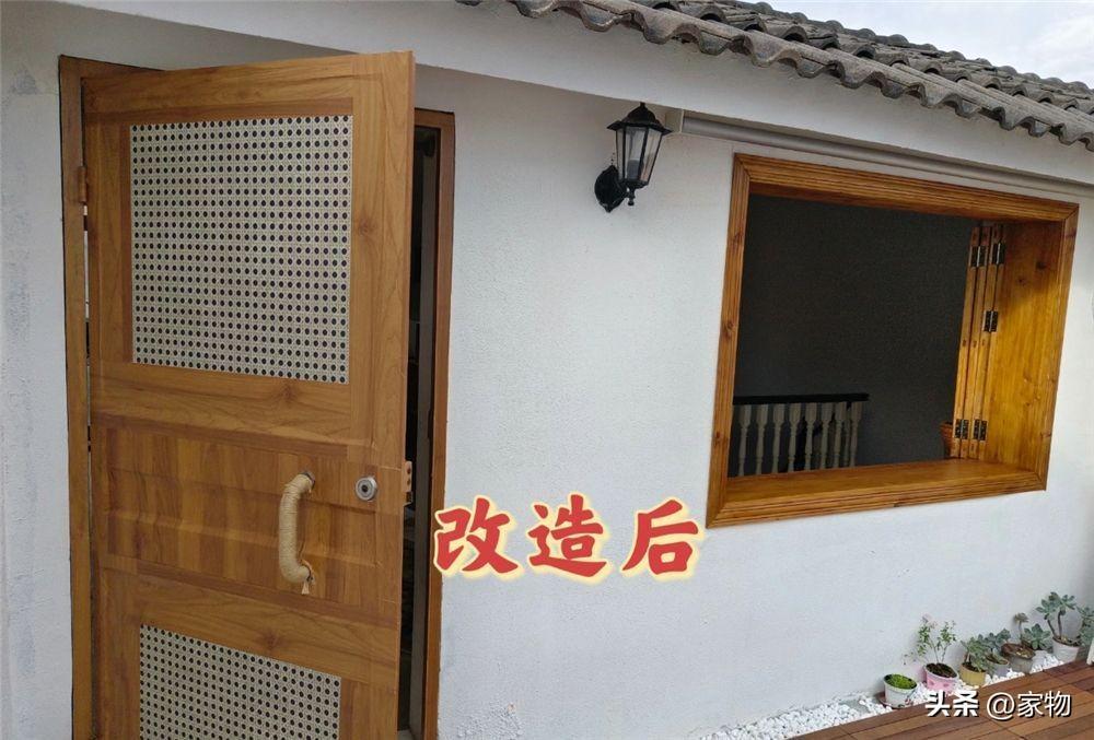 改造過後,這裏擺放了花架和小魚缸,之前鐵柵欄窗戶、屋檐邊上的牆面也被草蓆遮蓋,既能爲室內起到遮光的效果,同時也讓露臺空間看起來多了幾分田園色彩。