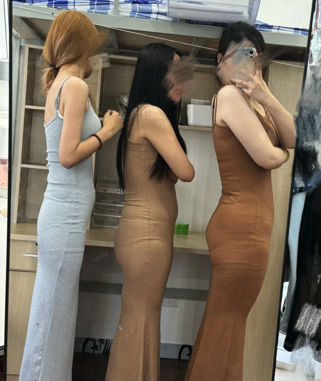 而咱們普通人上身之後,就是上圖這種效果了。這是一位大學生網友分享的真實買家秀,一個寢室三個姐妹都買了,有身材修長的,有身材勻稱的,有身材豐滿的,但穿在身上的效果都不盡人意,不僅沒有修飾身材,反而把本身身材上的缺點都暴露了出來。