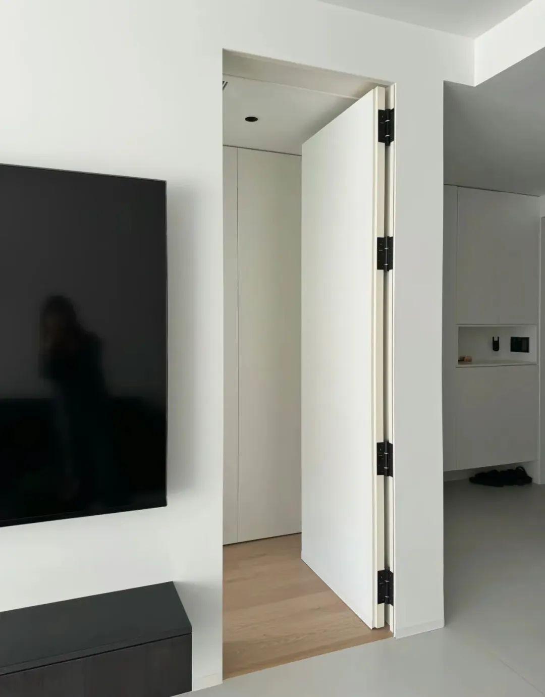 有些房屋佈局臥室門和客廳電視背景牆是同一堵牆,爲了保留電視背景牆的整體性,很多人會選擇做隱形門,門外不留鎖眼,只能從裏側鎖門。
