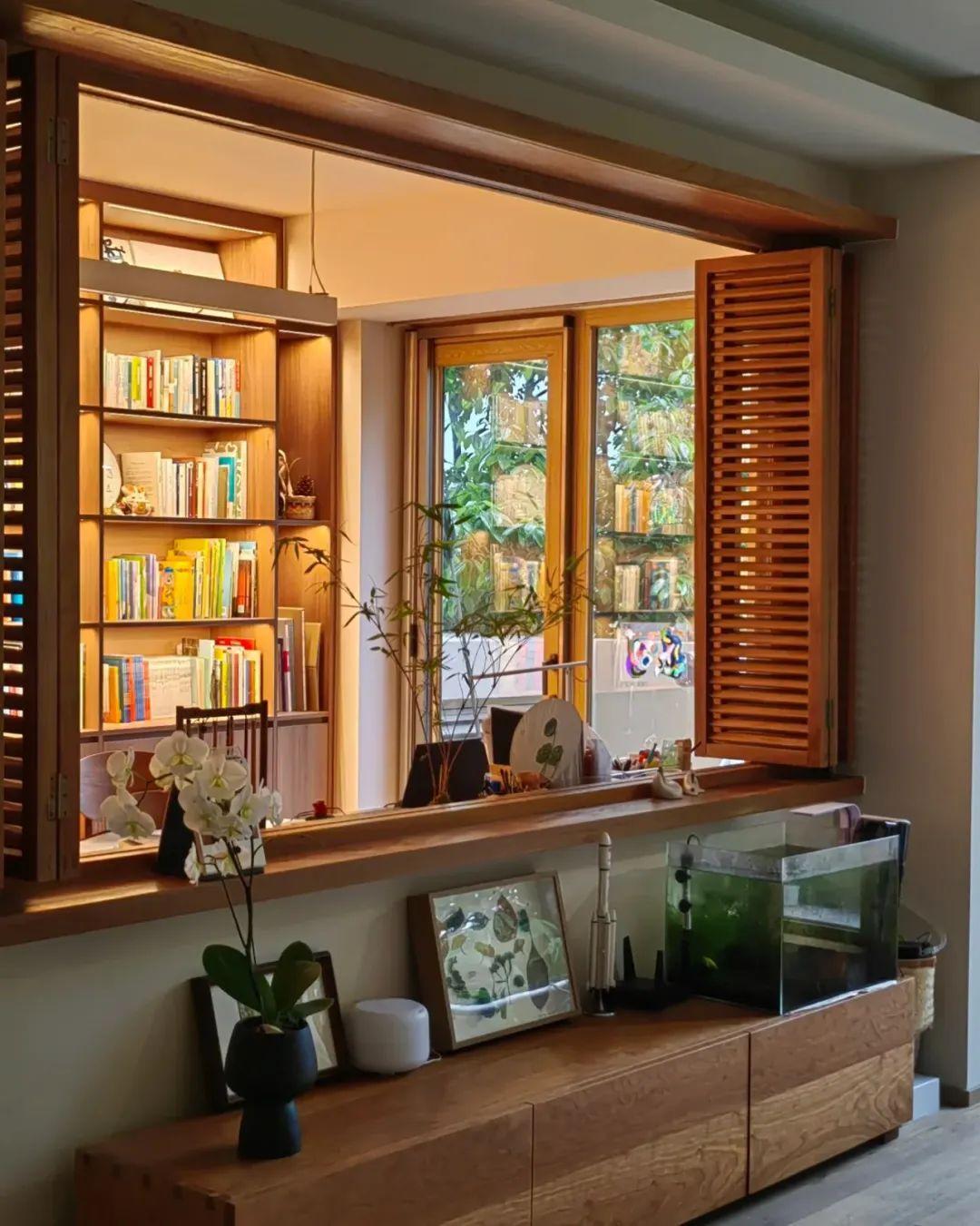 客廳和書房原本兩個相互獨立的空間,增加室內窗的設計,採光更好,整個空間更加通透,客廳和臥室的書房的互動性被拉滿。