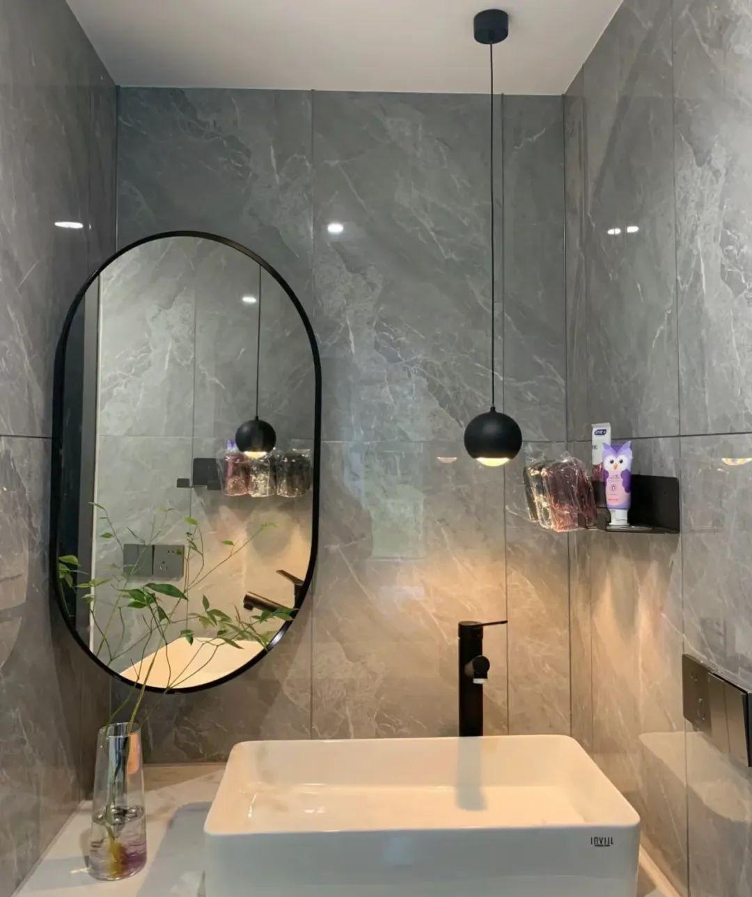 鏡子兩側和頂部的空餘空間裝層板,擺放每日要用的洗漱用品,保持檯面整潔。