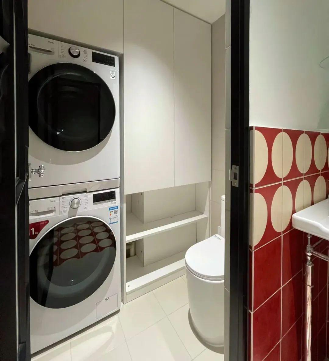 洗衣機烘乾機和馬桶在同一個區域,使用時間不會重合。