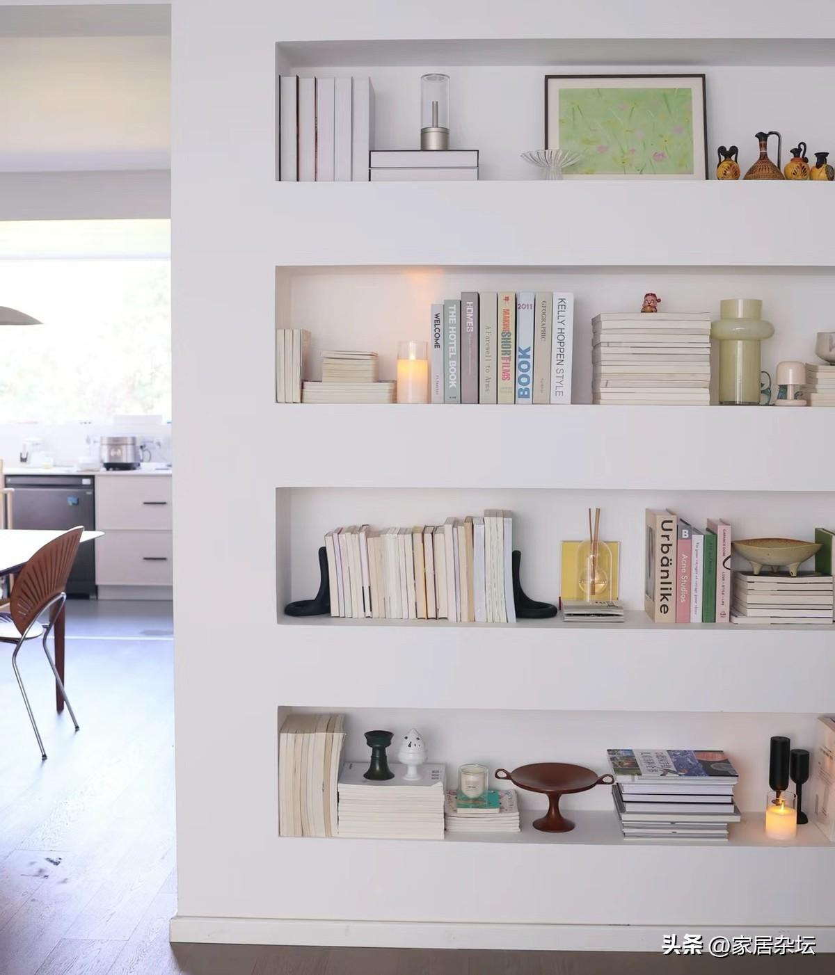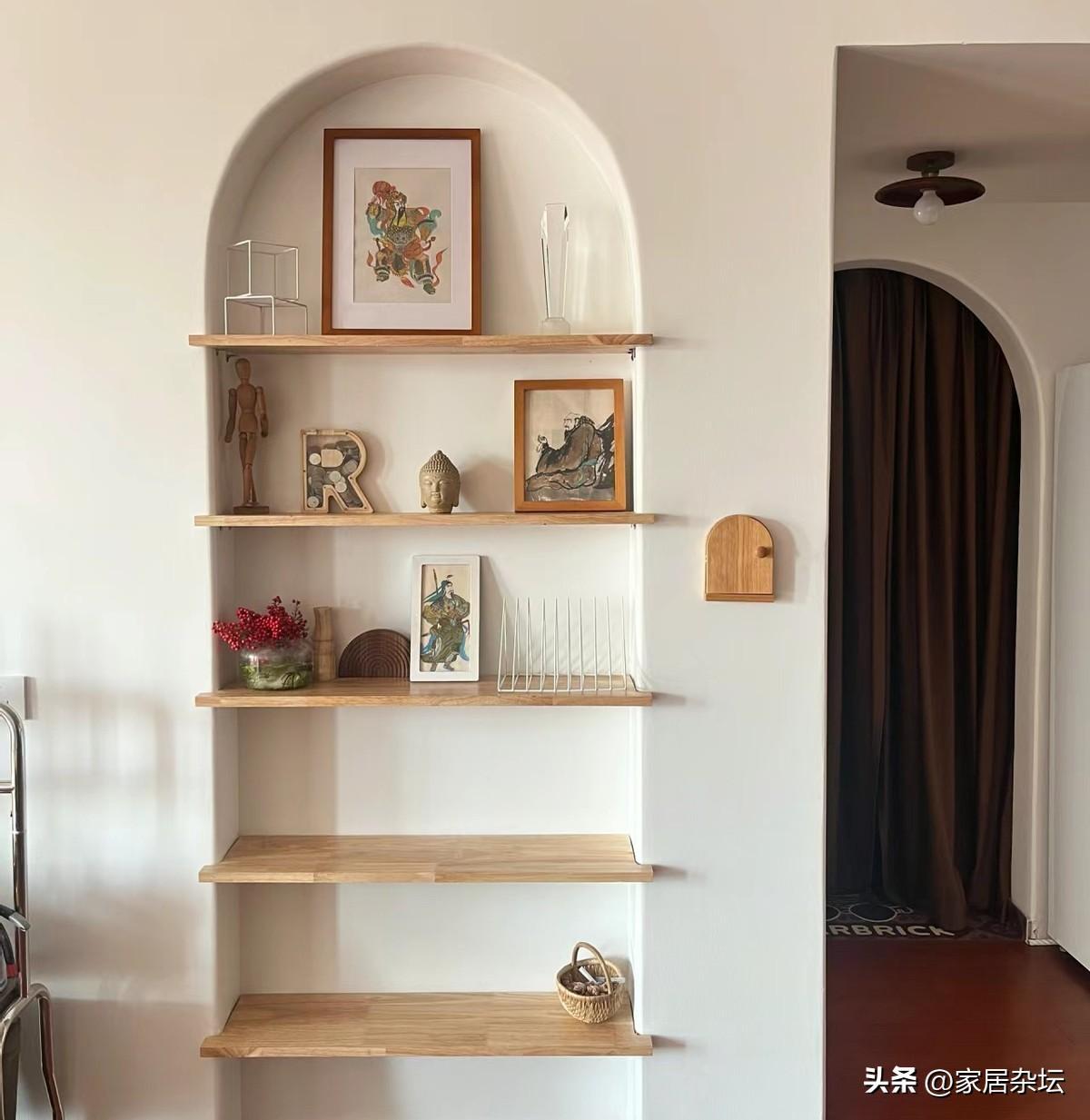 在牆上掏個小洞,直接把牆掏透了。然後利用這些洞,用板材,做成壁龕。一個好看的書架就出現了,很實用哦!
