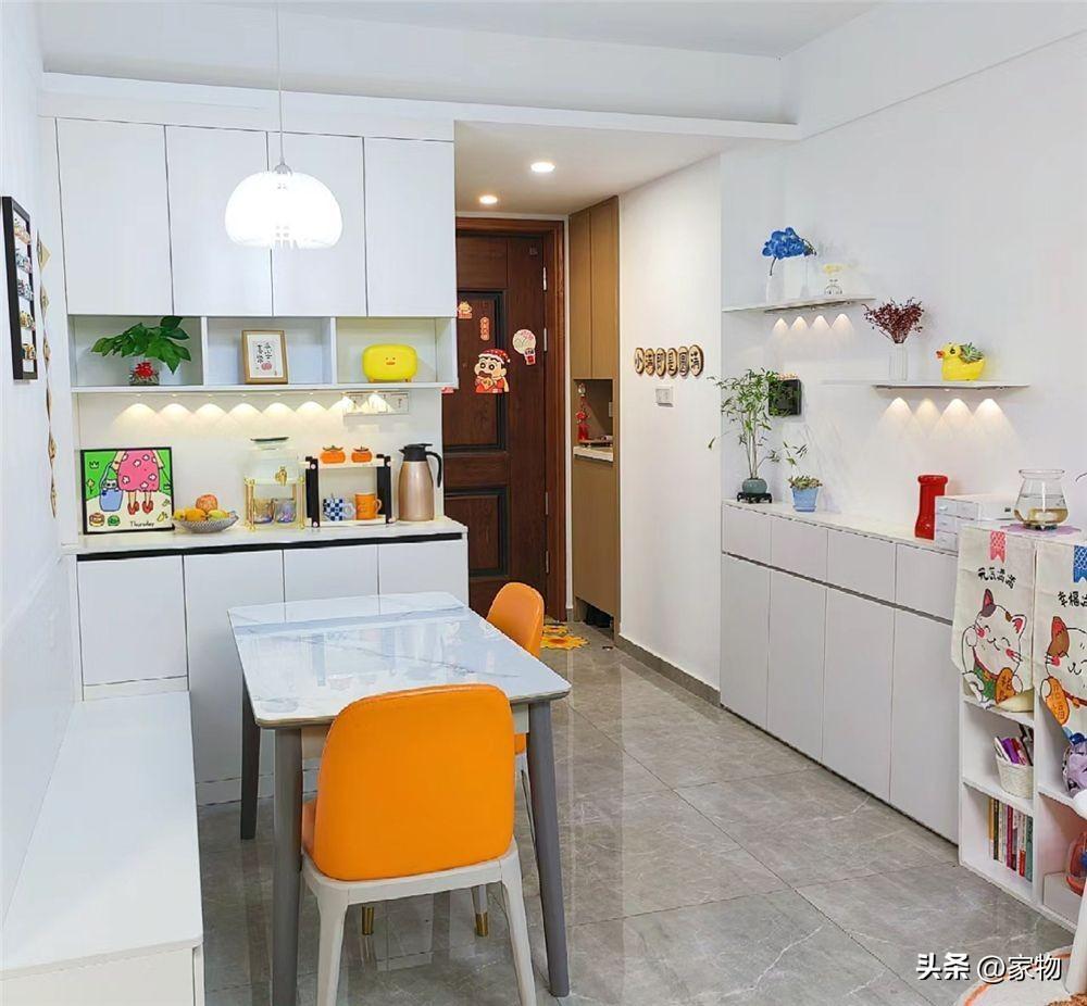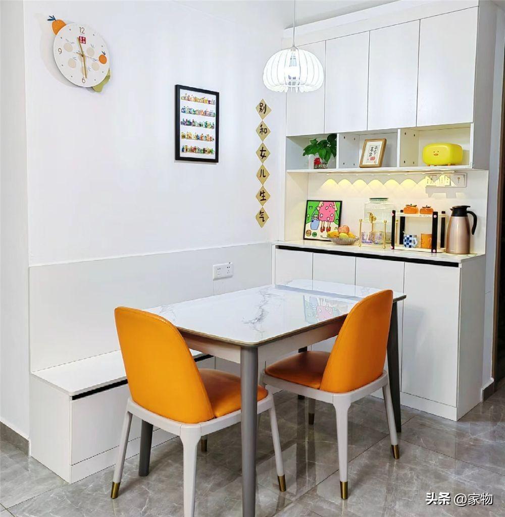 留給家裏餐廳的空間其實並不大,只有一進門這處角落的位置,但即便空間如此有限,一家三口還是在這裏做了卡座和定製餐邊櫃,將角落處變得井然有序,坐下一家三口完全沒問題。