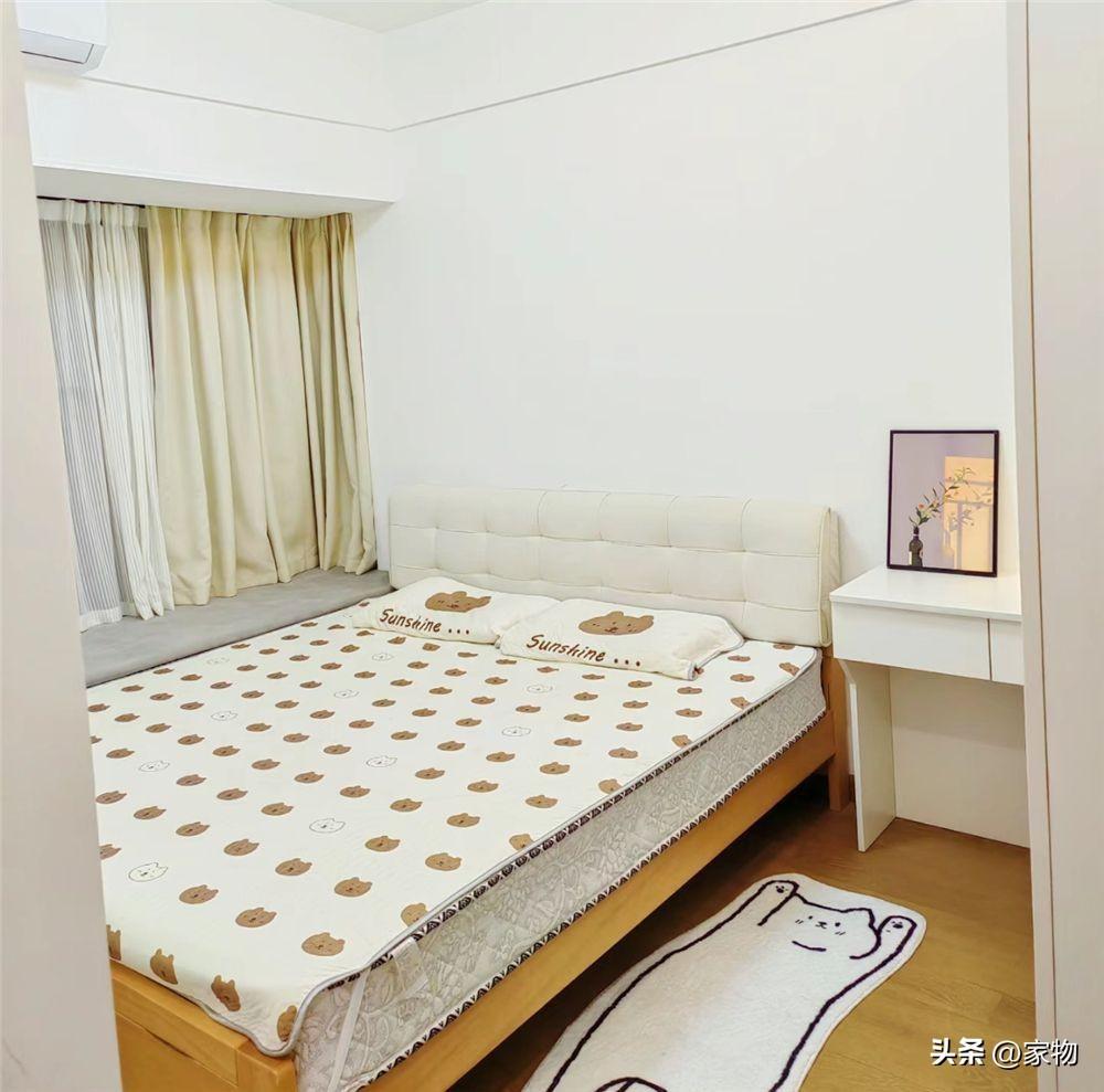 至於主臥室佈置也同樣簡單,雙人牀貼着飄窗擺放,高度正好做成了一樣的位置,無形間擴充了牀鋪空間,衣櫃放在一進門的位置,空間也剛好足夠。