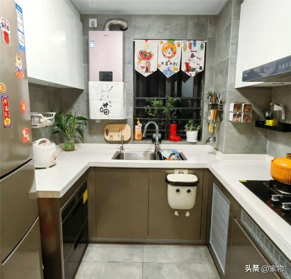 玄關旁的廚房內做U形格局,洗手池正對廚房窗,切菜區域、冰箱和竈臺分置兩側,動線合理、用起來格外靈活,小小的廚房,裝修佈置頗爲用心。