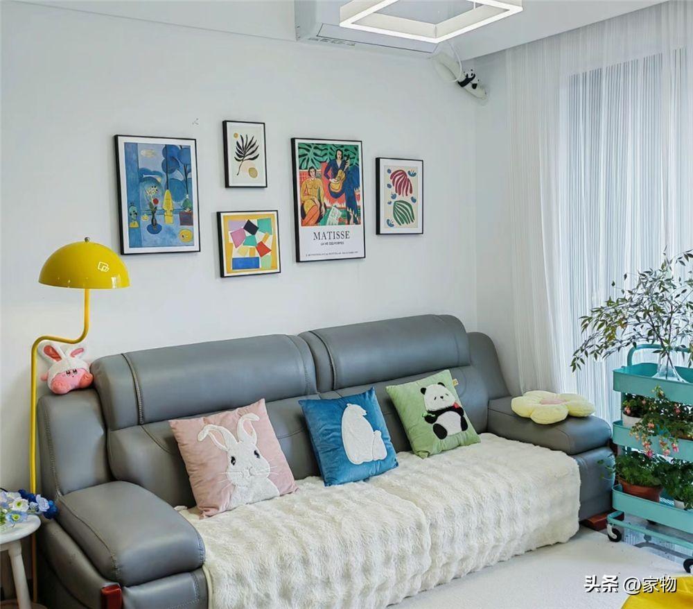 家裏的客廳開間很小,爲了能將這處區域充分利用,三口人選擇靠牆擺放長沙發,中間不放大茶几,對面的電視牆也不掛電視,想來算得上是去客廳化的裝修。