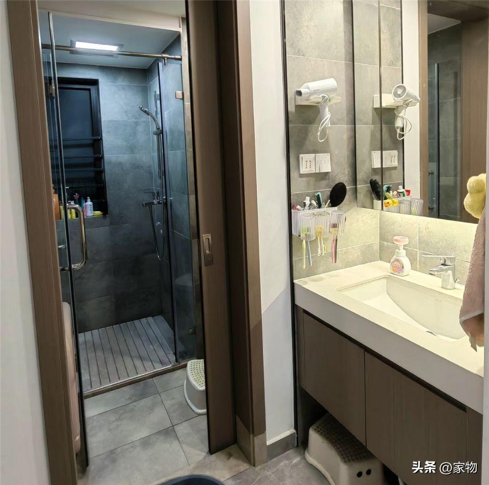 留給家裏衛生間的面積並不小,以至於可以將洗手檯外移出來,並且做玻璃淋浴屏進行乾溼分區,算下來也是個簡易的三分離格局了,或者說算是2.5分離吧。