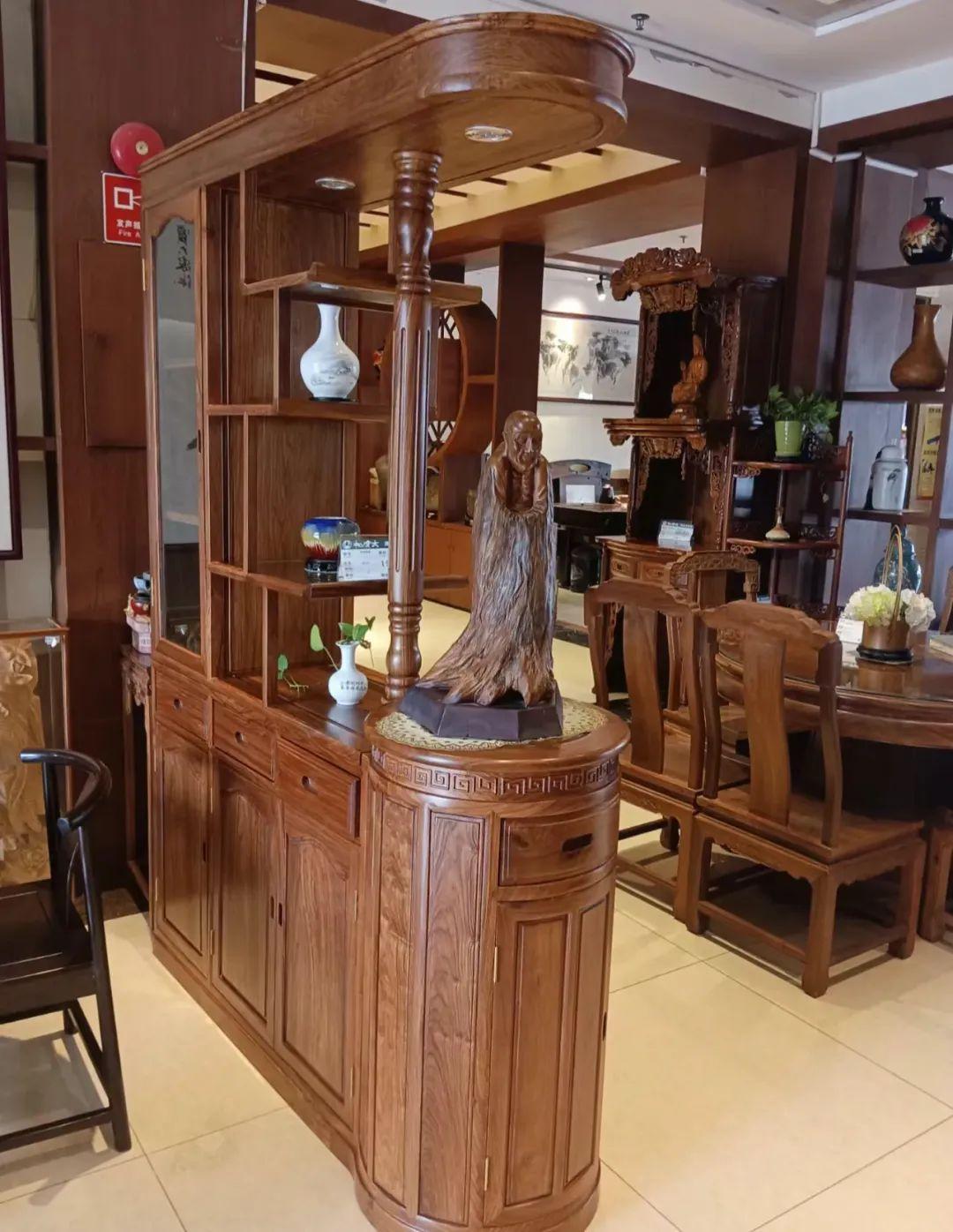 年輕人不怎麼講究風水,反而覺得這樣通風更好,屋內沒有異味,但耐不住家裏老人忌諱不已,好在這種中式隔斷櫃款式選擇多,顏值也不錯。再者,反正家裏全是紅木裝修風格了,再加個紅木隔斷櫃,也不嫌多。