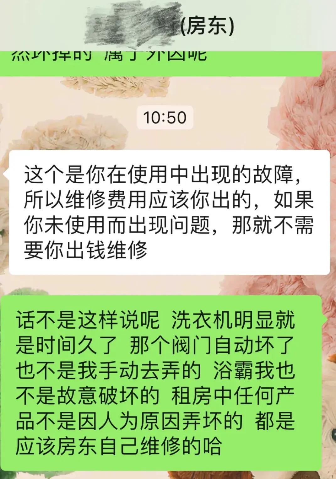 網友@我是大帥哥第一次租房,就碰到了個無良房東,洗衣機閥門自動壞了,說是我擰壞的,後面浴霸不亮了,也說該我出錢維修,我極力反對的結果是半個月不能用。
