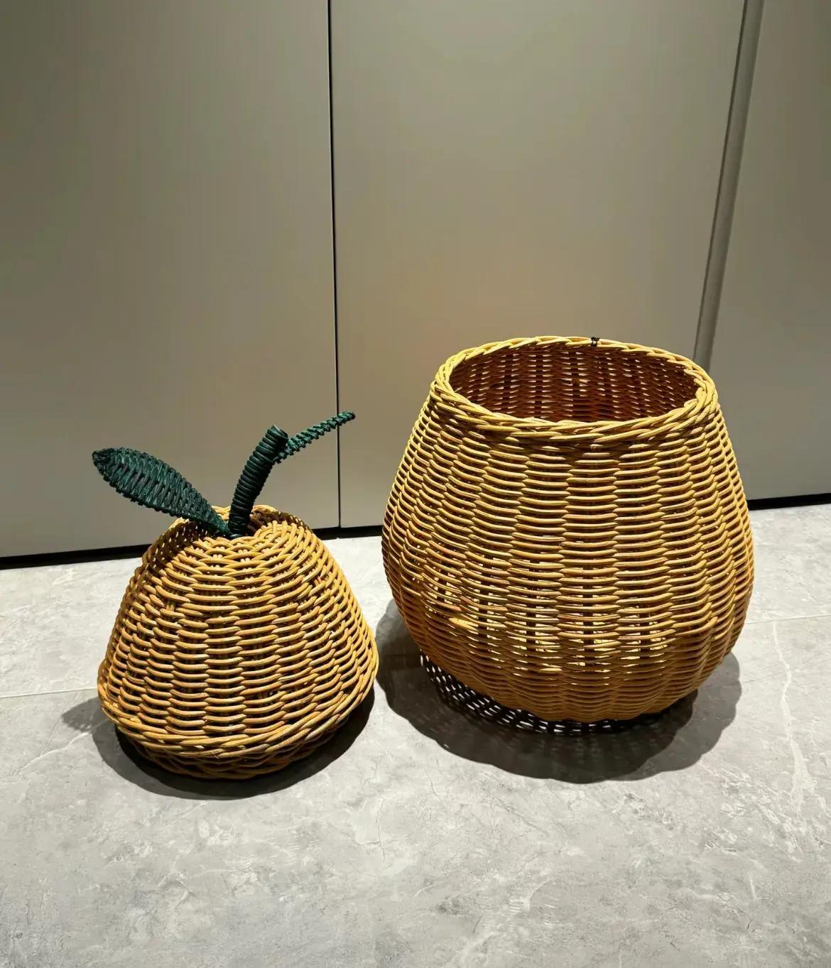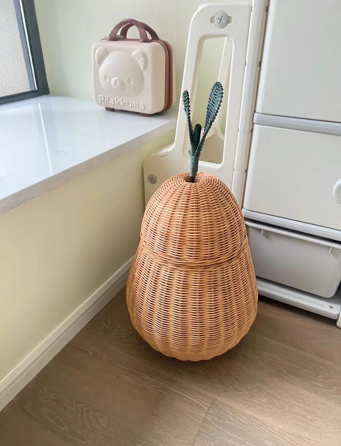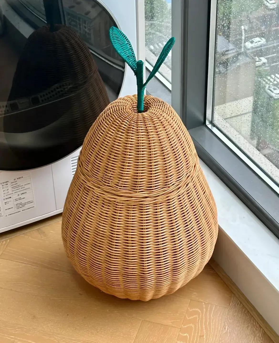 像這個收納筐,做成圓嘟嘟的大梨形狀後,放在家裏非但不土,還裝飾功能非常強。