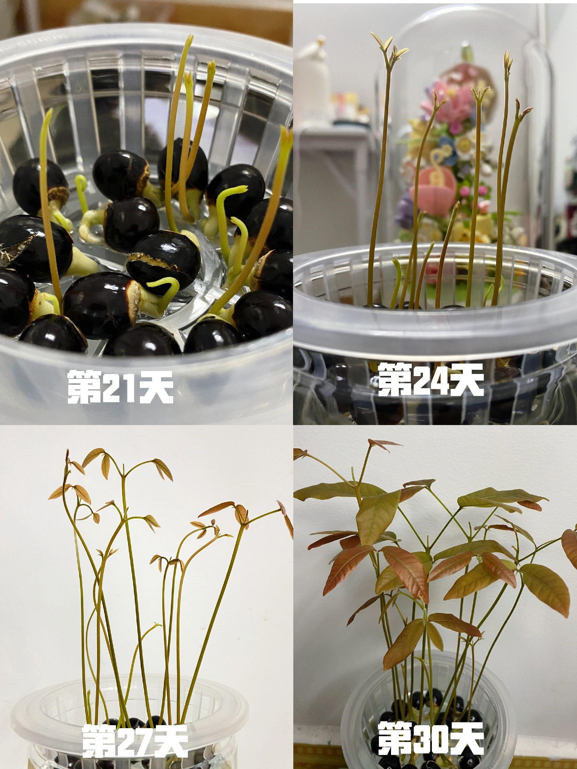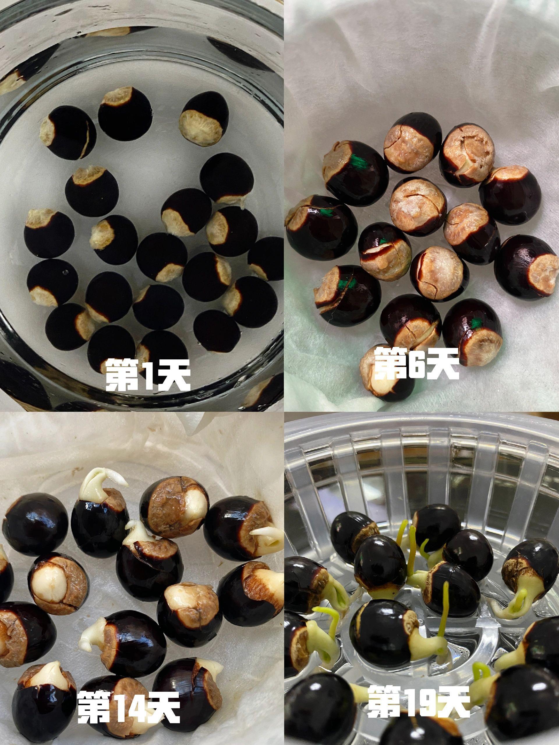 剝掉外殼後再用打溼的紙巾包裹住,放在密封袋裏保持溼潤的環境,幾天後就可以看到它出芽了,出芽率幾乎可以做到100%,差不多在20天左右,就能變成小苗,接着再把小苗移到水裏進行水培即可。