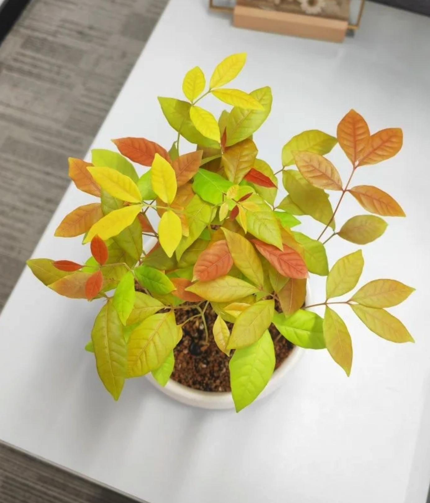 像上圖這一盆,是避光養的,所以擁有彩色的葉子,簡直是顏值爆表,出根後也可以轉土栽,搭配一個白色花盆就能非常漂亮,紅黃橙相間的葉子寓意紅紅火火,放在家裏簡直太合適了!(同理,龍眼的“親戚”荔枝核也可以這樣種,顏值更高!)